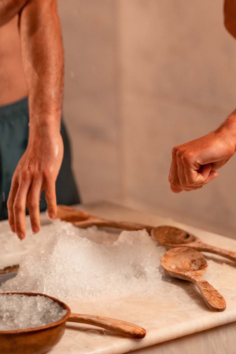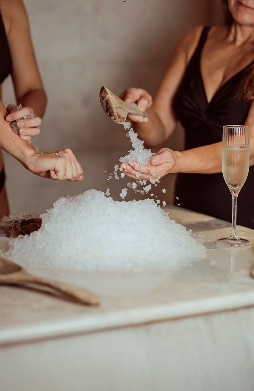 Sittandes på marmorbänken får du en inledande uppmjukning av fötterna. Sedan ett fotbad som spetsas med de finaste salter samt behandling för att få fart på cirkulationen. -