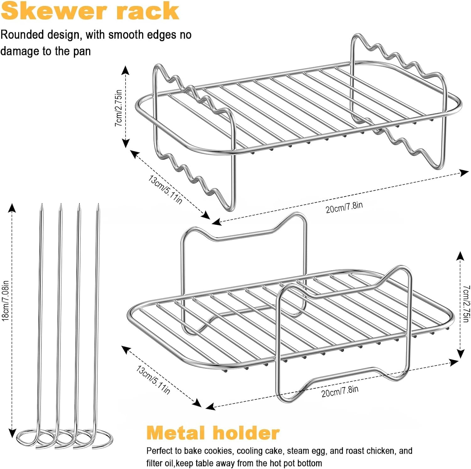 Set med två olika grillställ för AirFryer. Ena stället passar för det mesta, det andra stället är för de fyra medföljande grillspetten.