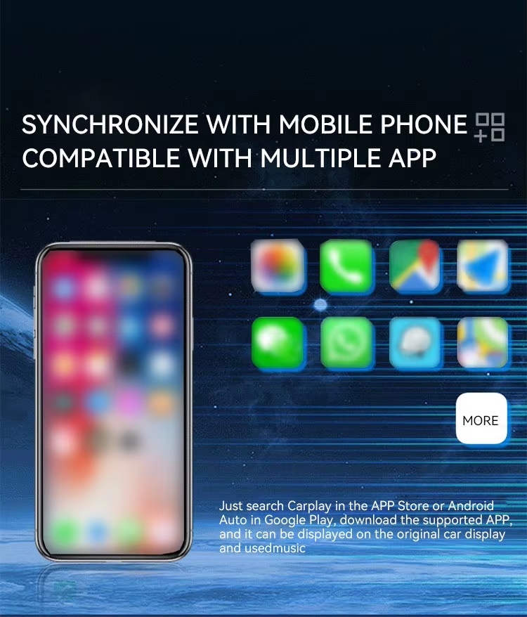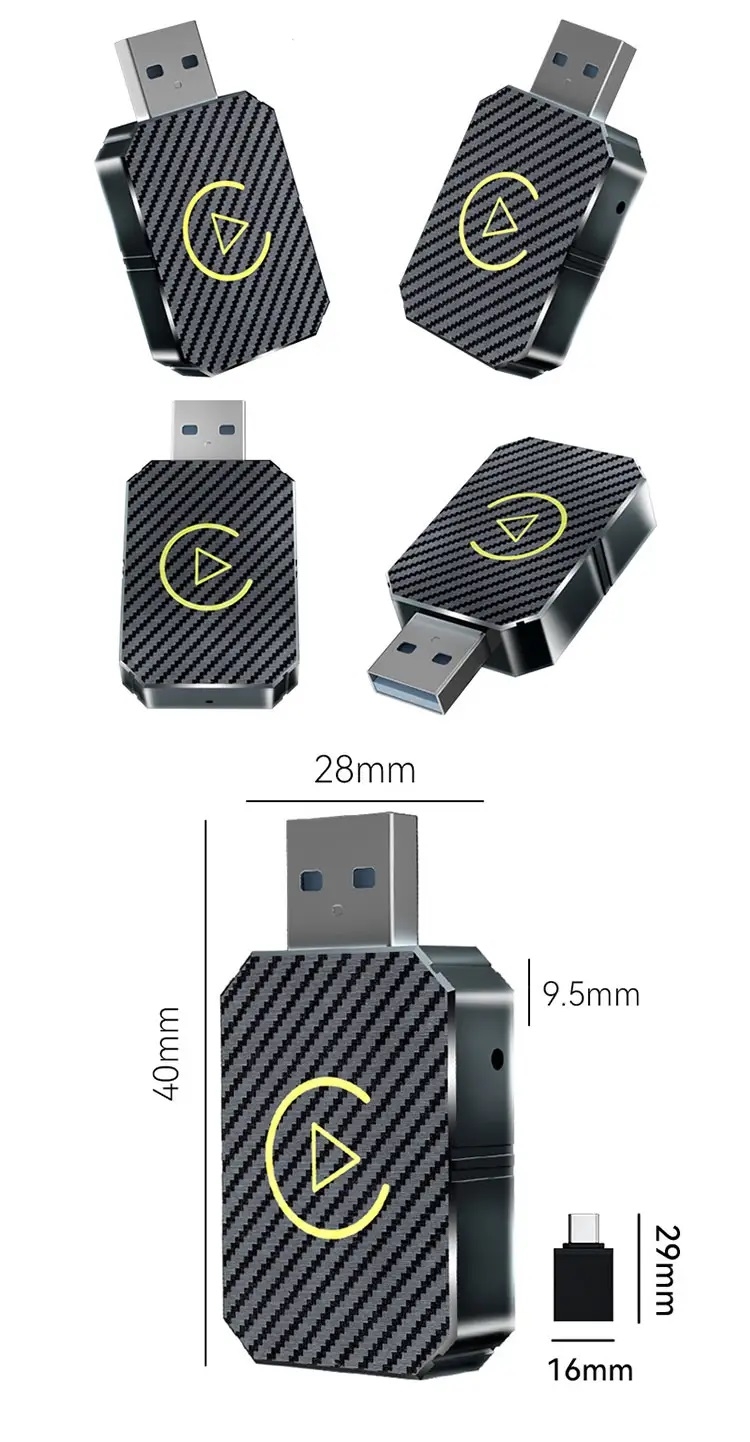 Med stöd för både iPhone (iOS 9 eller senare) och Android-enheter möjliggör adaptern trådlös anslutning via Bluetooth och WiFi, vilket eliminerar behovet av kablar. Installationen är enkel och kräver endast att adaptern ansluts till bilens USB-port för att omedelbart aktivera en intuitiv och problemfri integration.
