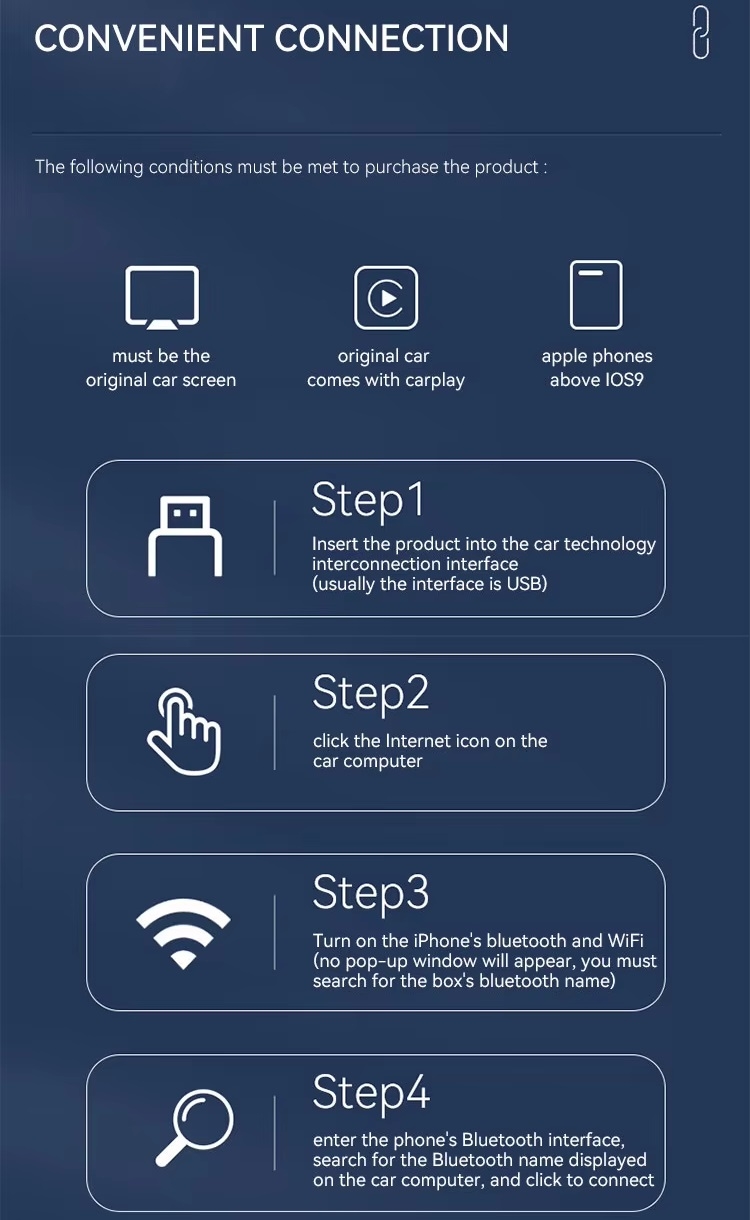 Denna adapter är den optimala lösningen för bilägare som vill uppleva en trådlös, modern och problemfri uppkoppling – perfekt för en trygg och bekväm körupplevelse.
