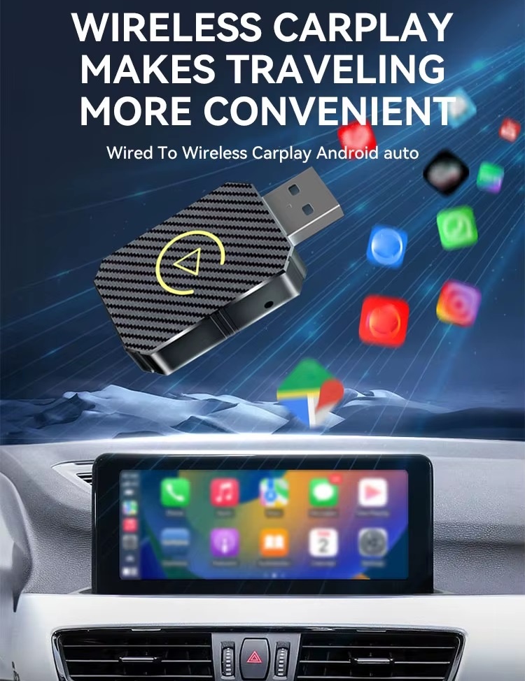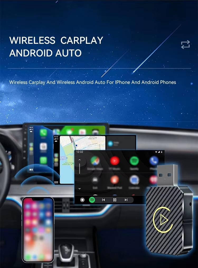 Uppgradera din bil med den senaste tekniken genom denna trådlösa CarPlay- och Android Auto-adapter. Den erbjuder en sömlös och bekväm anslutning för