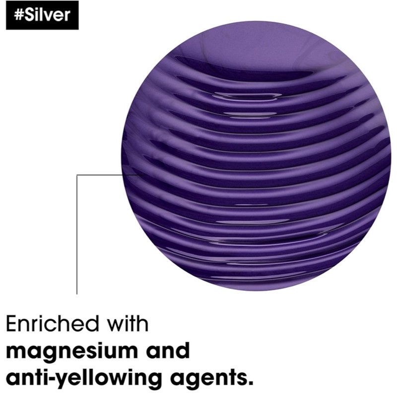 L'Oreal Professionnel Serie Expert Silver Shampoo är ett neutraliserende uppljusande shampoo till grått vitt hår. Berikad med violette pigmenter og magnesium*. En kombination av anti-gulnande
