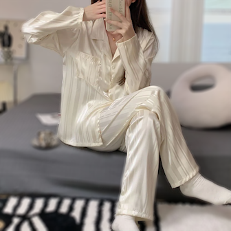 Sov gott i en skön pyjamas med glansig struktur. Setet består av en långärmad skjorta och ett par byxor. Skjortan har krage och slag samt knäppning framtill.
