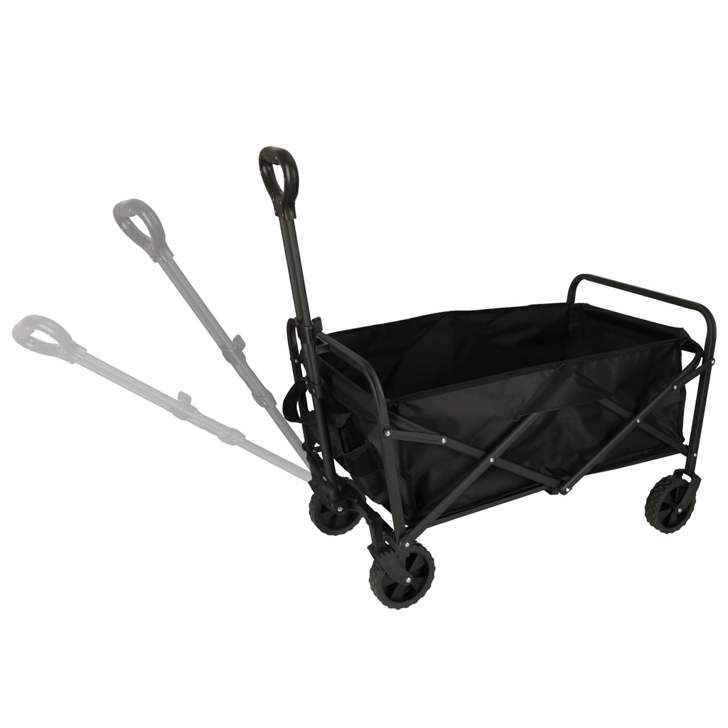 Vagnen är enkel att manövrera tack vare svängbara framhjul som roterar 360° och har broms för extra kontroll. Handtaget är justerbart, låsbart och ergonomiskt utformat för bekväm körning. När den inte används viks den enkelt ihop och tar minimalt med plats vid förvaring.