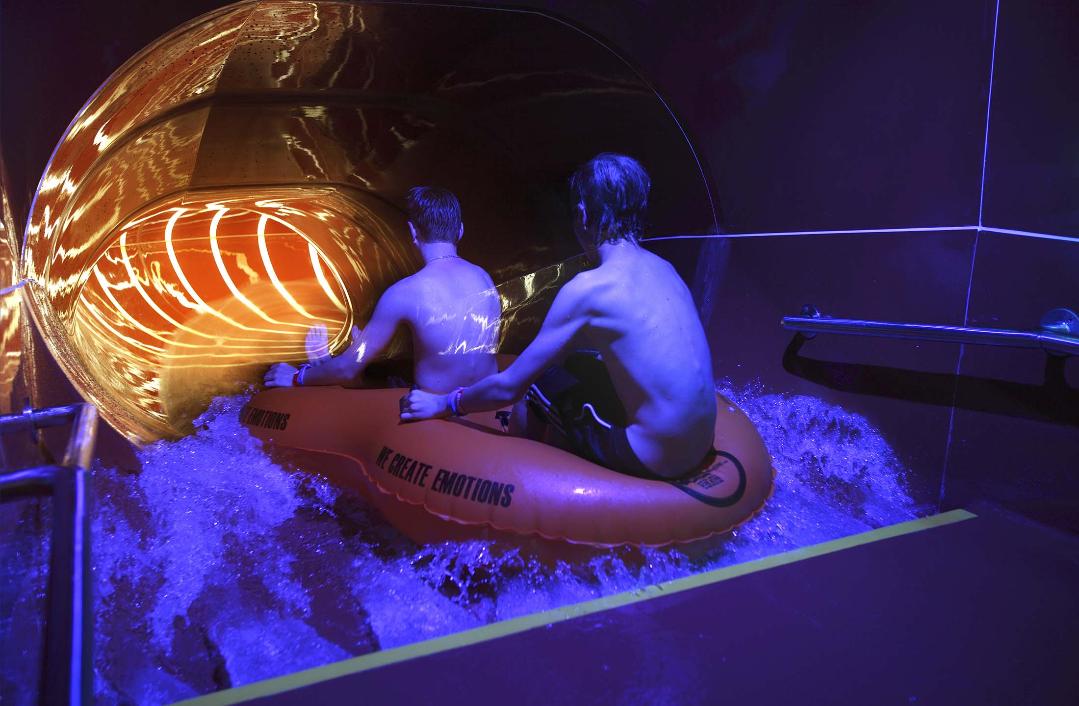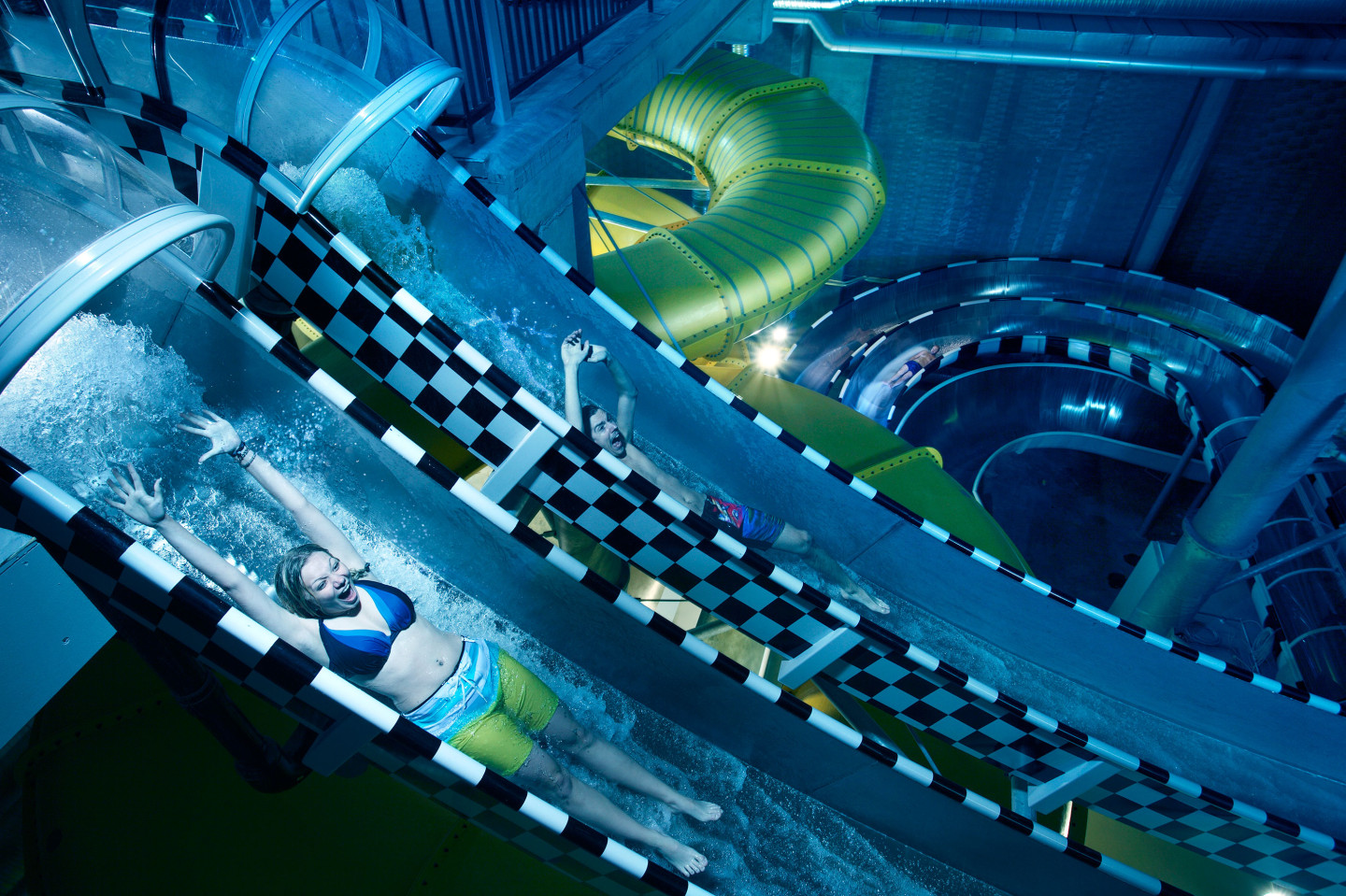 Tävla sida vid sida i en parallellbana med tidtagning och startljus. (Obs! Ena vattenrutschbana är avstängd för underhåll)