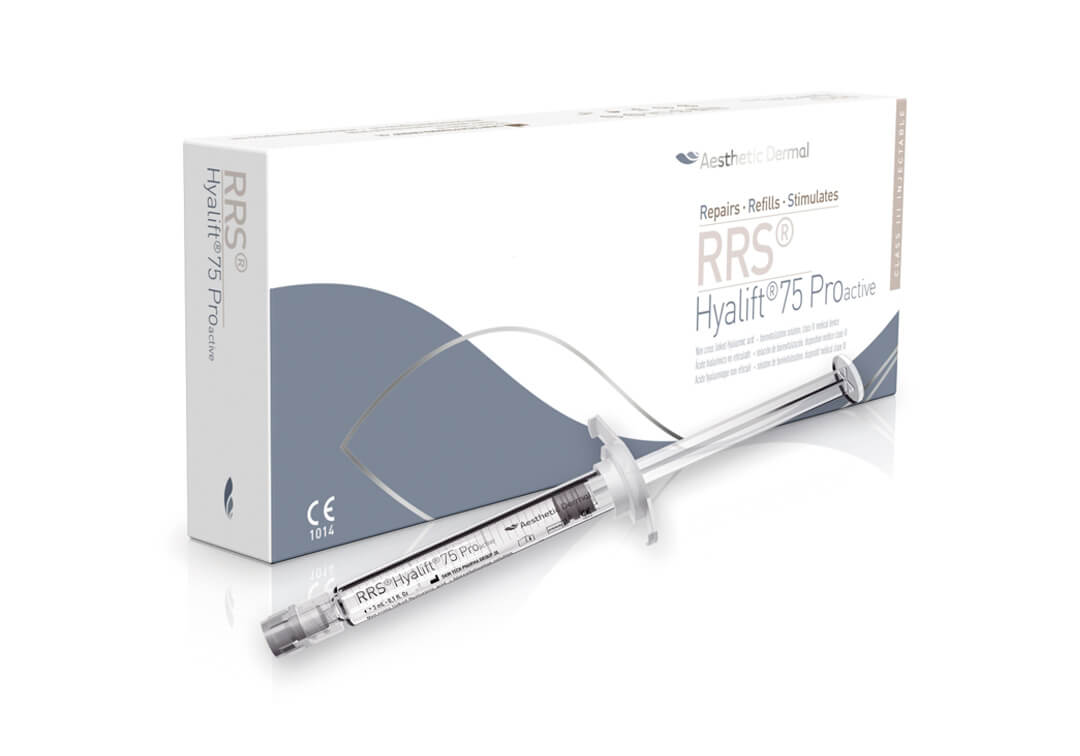 Hyalift Pro75 skinbooster är djupfuktande hudbehandlingar med långsiktig effekt, som skapar en naturlig glans och fräscht utseende på huden. RRS Hyalift 75 Proactive erbjuder en av de högsta koncentrationerna på absorberbar icke-tvärbunden hyaluronsyra med 45 mg i 3 ml spruta som används för att fylla ytliga rynkor. RRS Hyalift skinbooster injiceras i små doser under huden, där det attraherar vätska som skapar en längre och en djupfuktande effekt av huden från insidan. På så sätt förbättras även hudens elasticitet, struktur och volym.