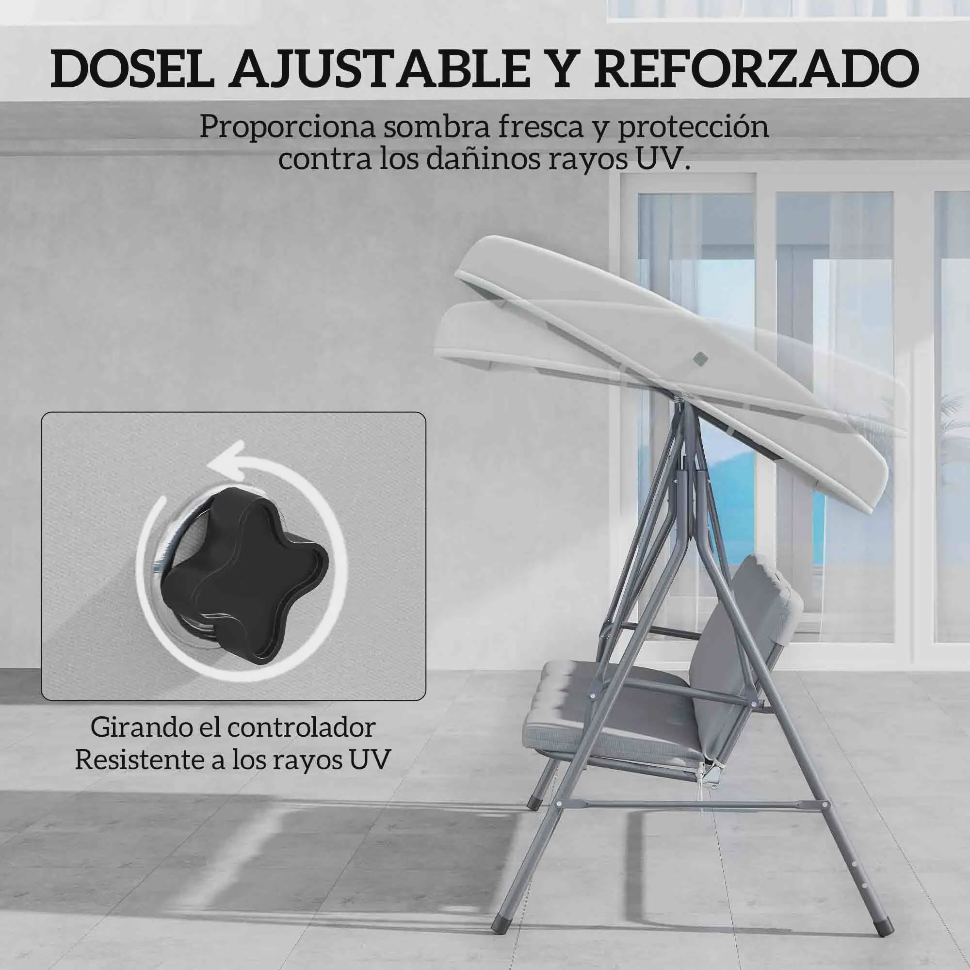 Den stabila stålramen ger hög hållbarhet medan det justerbara taket skyddar mot sol, UV-strålning och lätt regn. De mjuka dynorna gör sittupplevelsen extra bekväm.