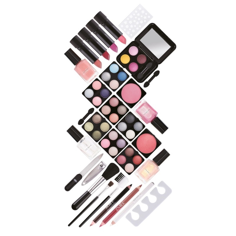 Innehåller: Sminkbox, 32st ögonskuggor, 2st rouger, 4st läppstift, 4st nagellack, 1st dubbeländad läppenna, 1st dubbeländad kajalpenna, 1st vit nagelpenna, 1st tåseparerare, 1st nageldekoration, 3st applikatorer, 2st borstar och 1st spegel.
