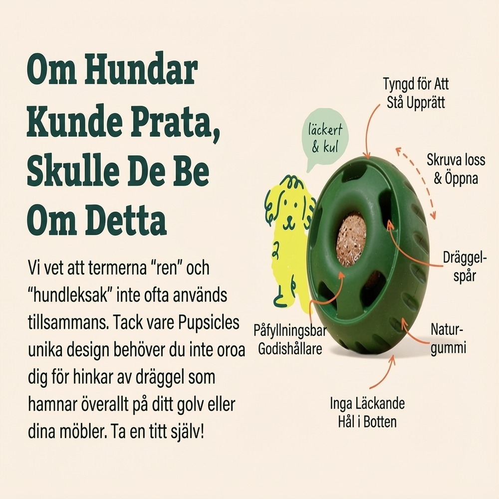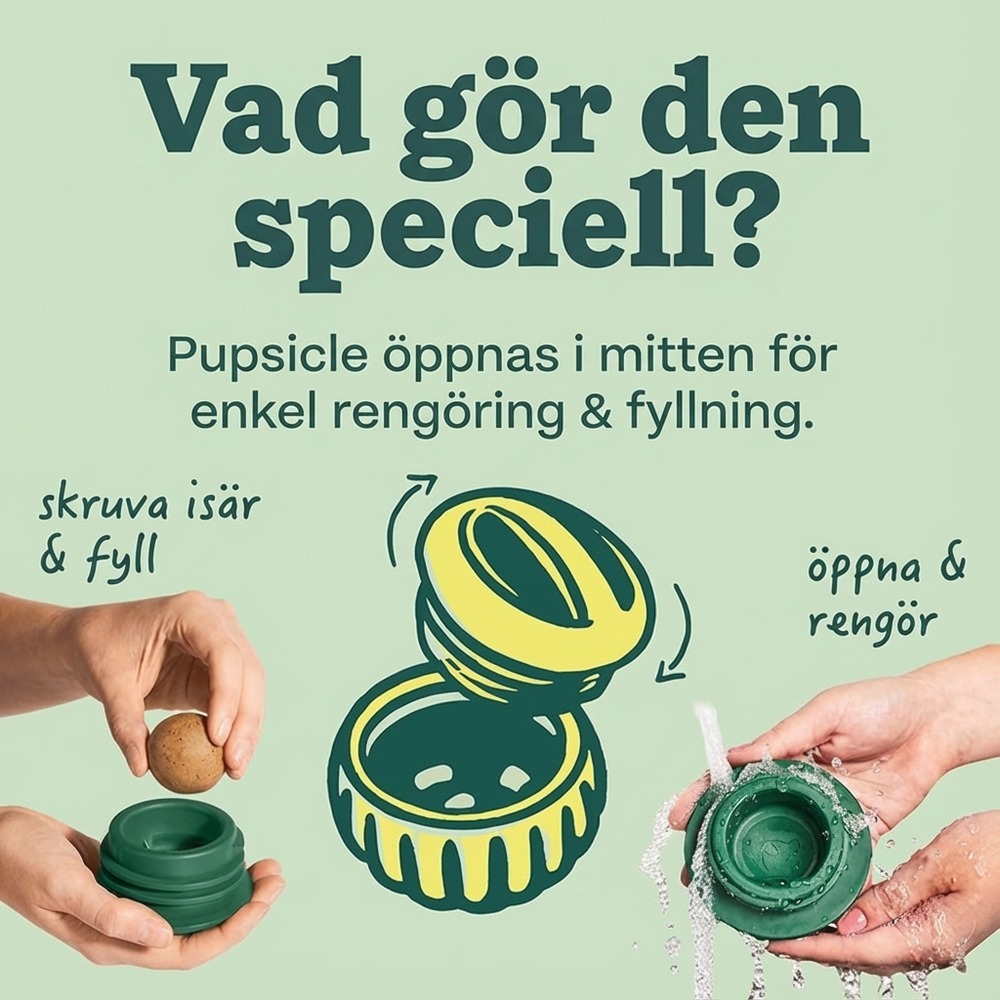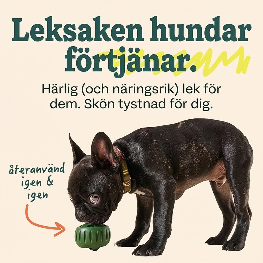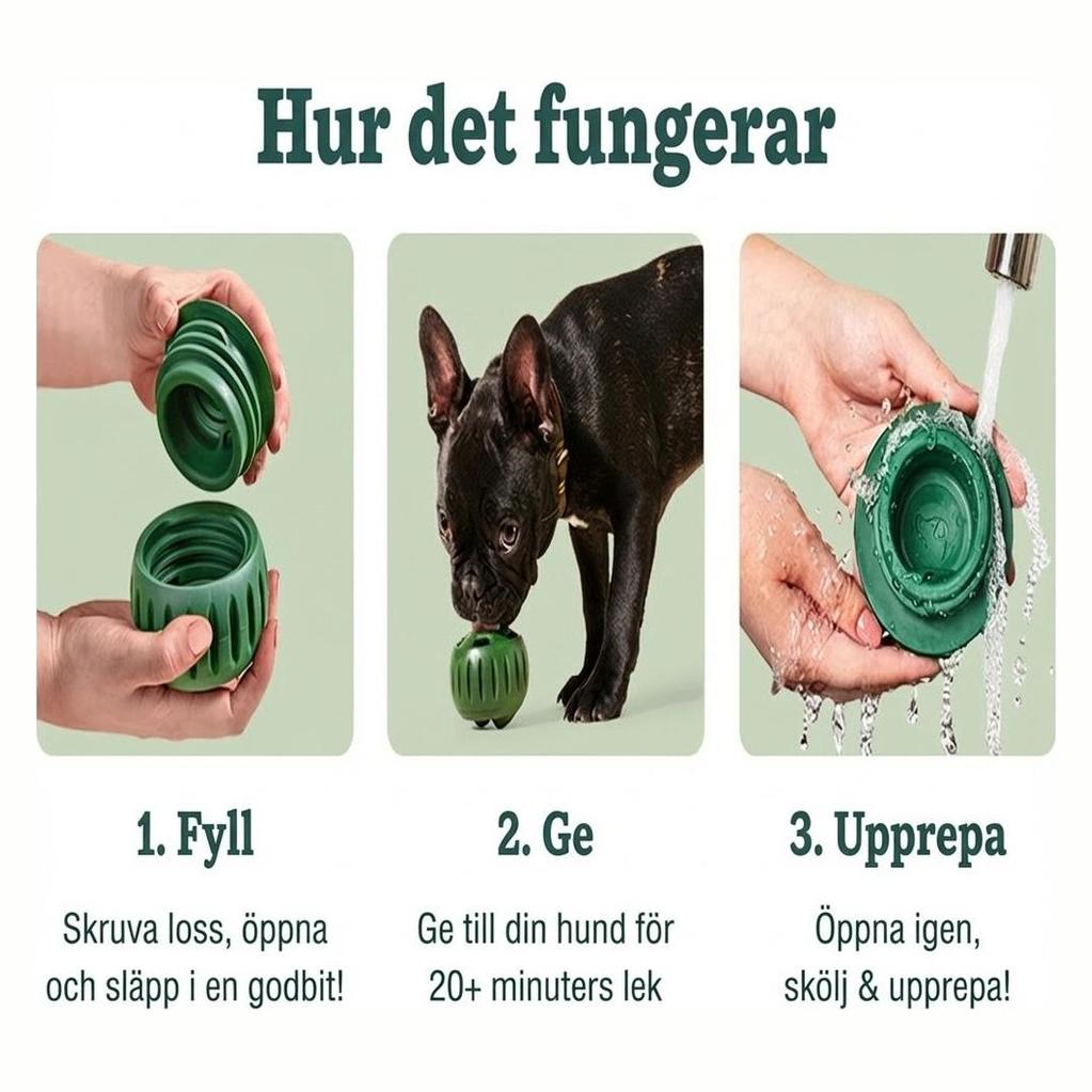 För jämn utdelning fungerar små, torra bitar bäst. Skölj i ljummet vatten efter användning och låt lufttorka innan nästa fyllning. Rekommenderas vid övervakad lek, särskilt för hundar som tuggar hårt.