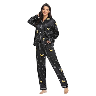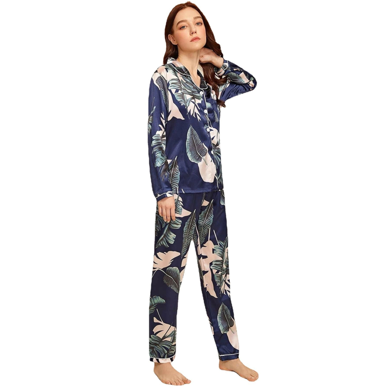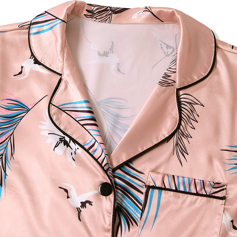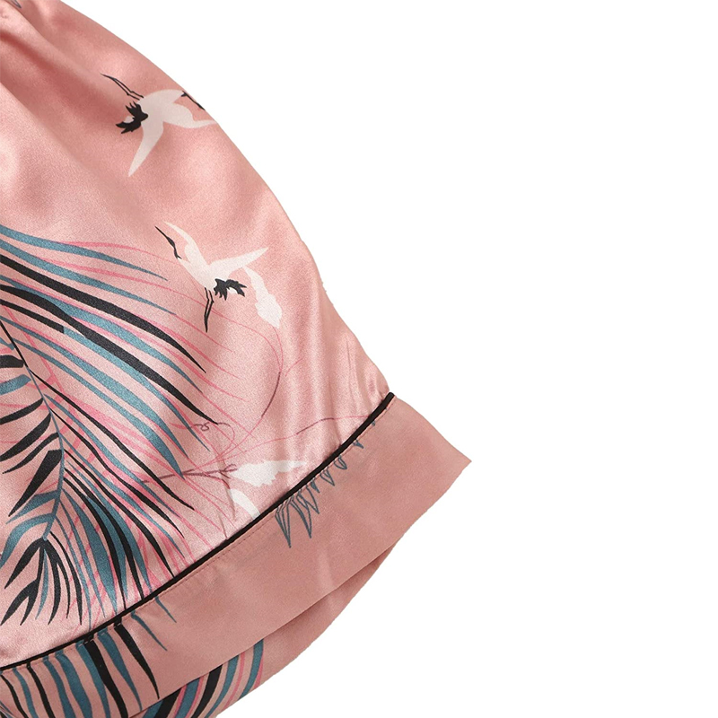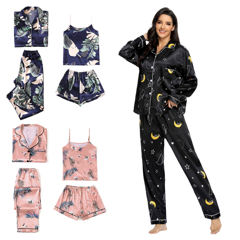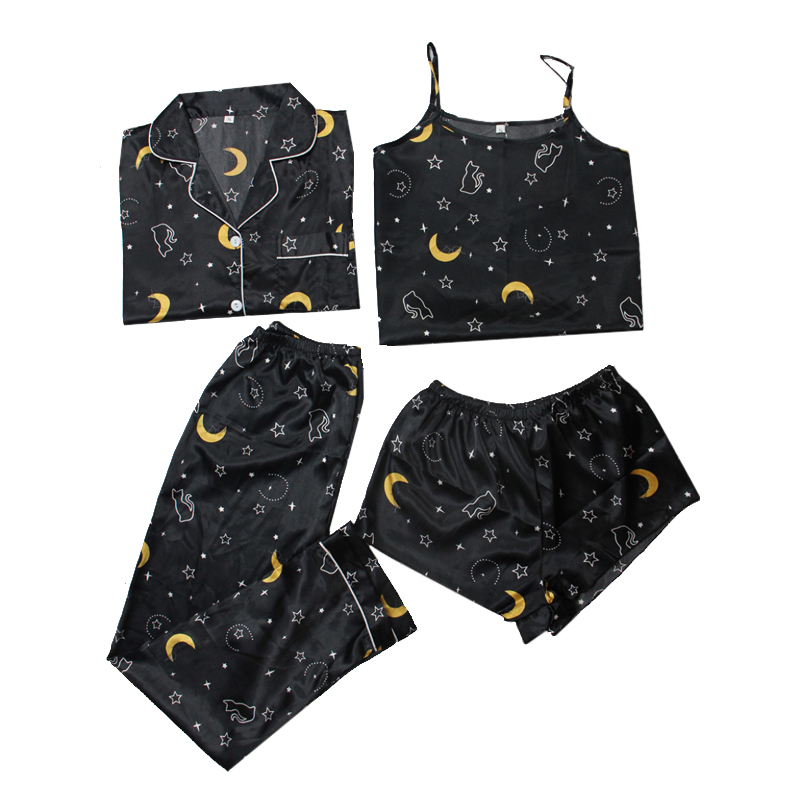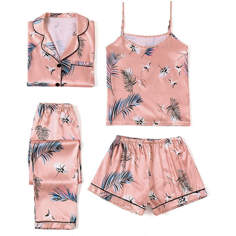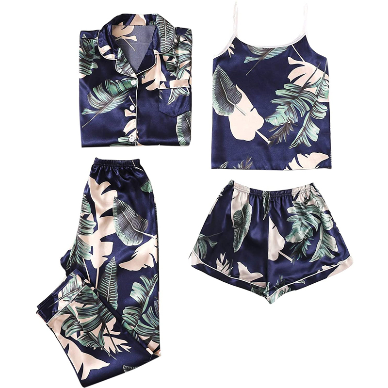Skönt pyjamas set om fyra innehåller en cami-topp, shorts, en långärmad skjorta med knappar och ett par byxor. Skönt att ha både hemma till vardags och som nattkläder!
