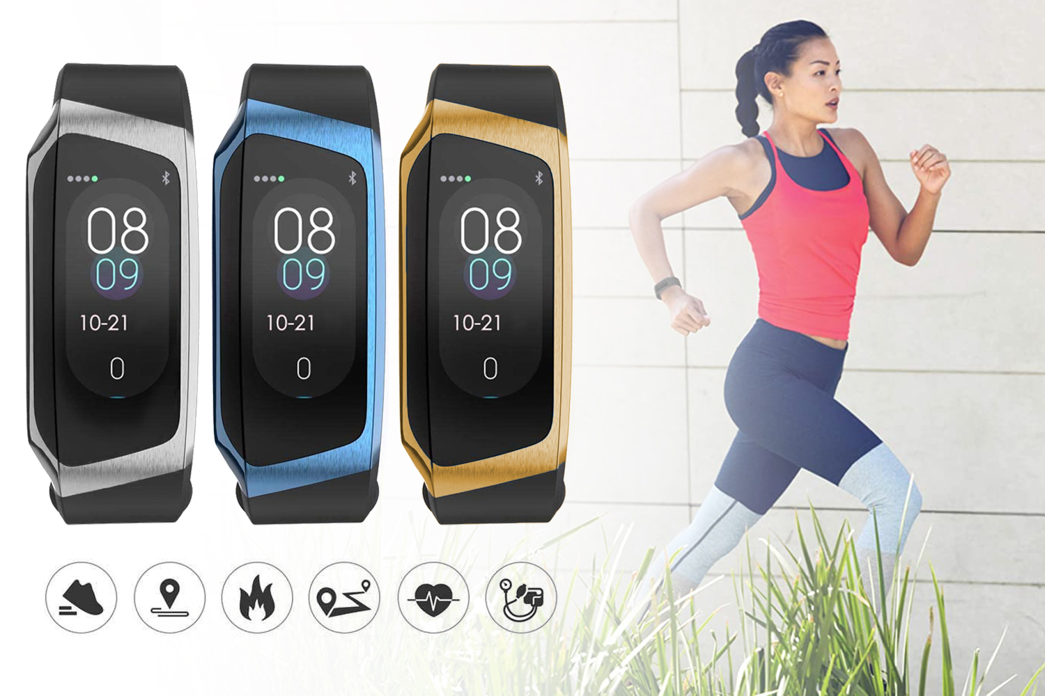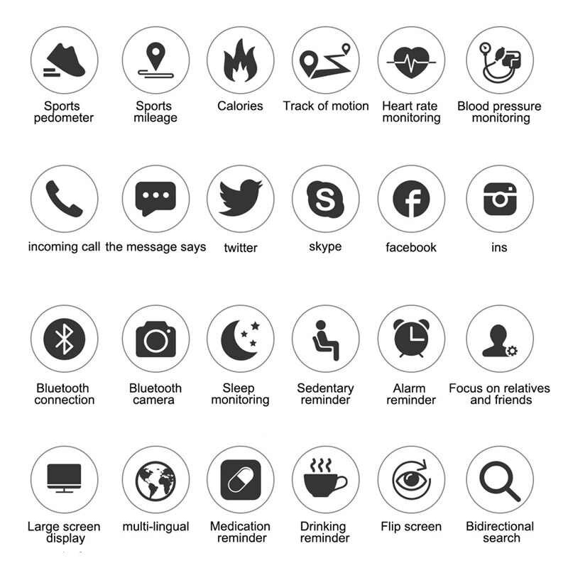 - Funktioner: Blodtrycksmätare, pulsmätning, GPS-rörelsespår, smart väckarklocka, stillasittande-påminnelse, hälsa, sportpedometer, tvåvägssökning, fjärrkamera, sms, kaloriförbränning, QQ-vy, Wechat-vy, Skype-vy, Whatsapp, Facebook-vy, sömnövervakning, inkommande samtal, medicineringspåminnelse, dryckpåminnelse, mötespåminnelse, metrisk switch, flerspråkig, tid och datum