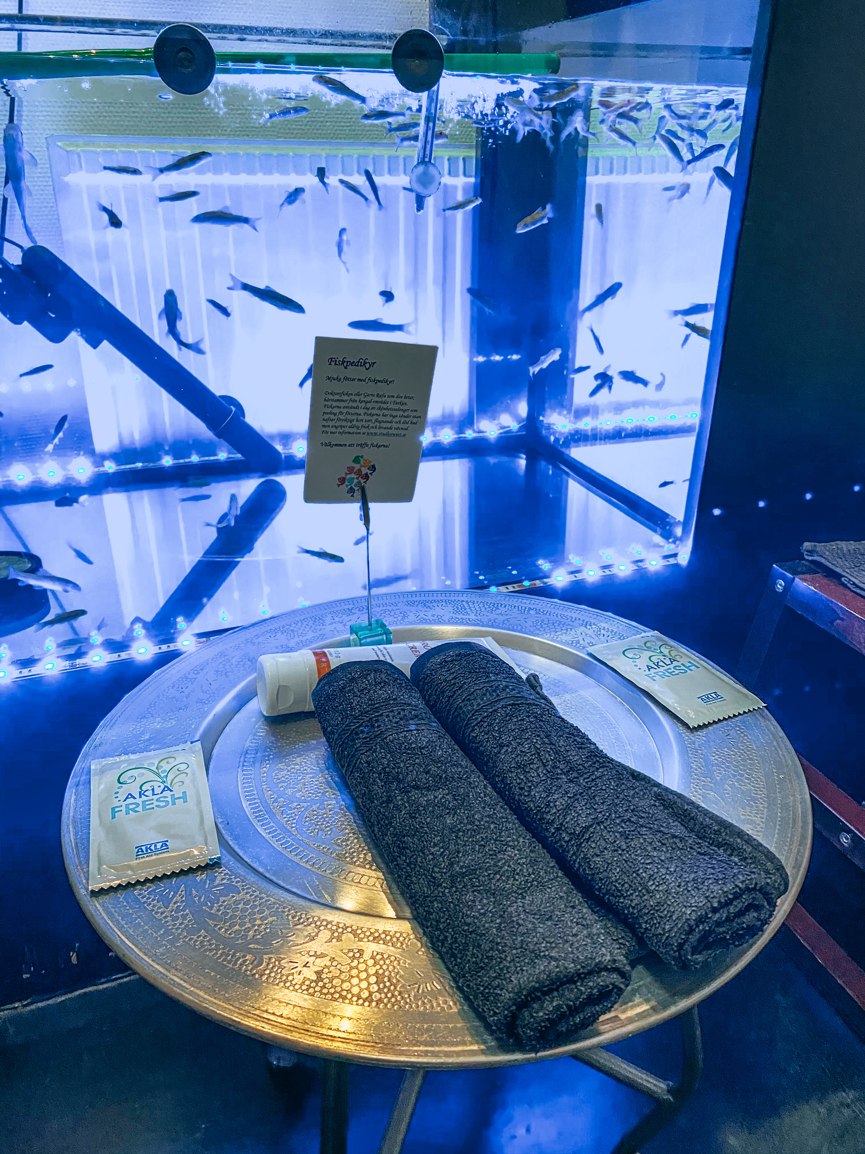 Låt hungriga fiskar försköna dina fötter på en härlig fotbehandling i Haga. Fiskarna nafsar med nöje bort torr och död hud för att dina fötter ska kännas underbart sköna. Har du inte testat så passa på, perfekt aktivitet att avnjuta med en god vän!
