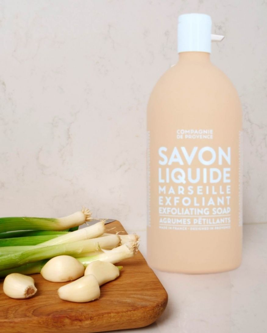 Den flytande Marseille tvålen tillverkas i kittel enligt den klassiska metoden och innehåller finkrossade olivkärnor från Medelhavet som ger en mild och naturlig skrubb. De små kärnorna hjälper till att avlägsna döda hudceller och lämnar huden ren, mjuk och redo för återfuktning helt utan plastpartiklar. Formulan är så skonsam att den kan användas varje dag både på händer och kropp.