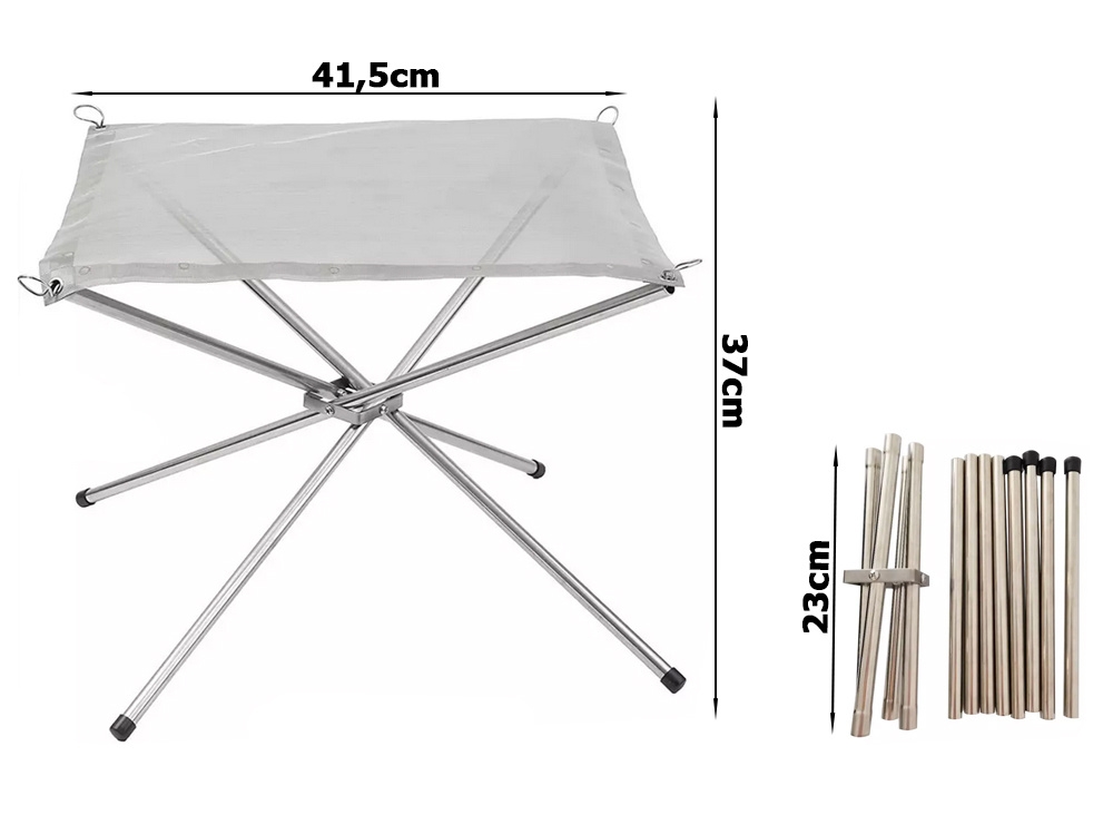 Ställningen är hopfällbar, vilket innebär att den tar upp väldigt lite utrymme och är lätt att ta med på vilken resa som helst. Nätet på ställningen är tillverkat av en unik stål-legering så att den kan stå emot mycket höga temperaturer. Nätet har mycket små maskor så att askan inte faller ner på marken.