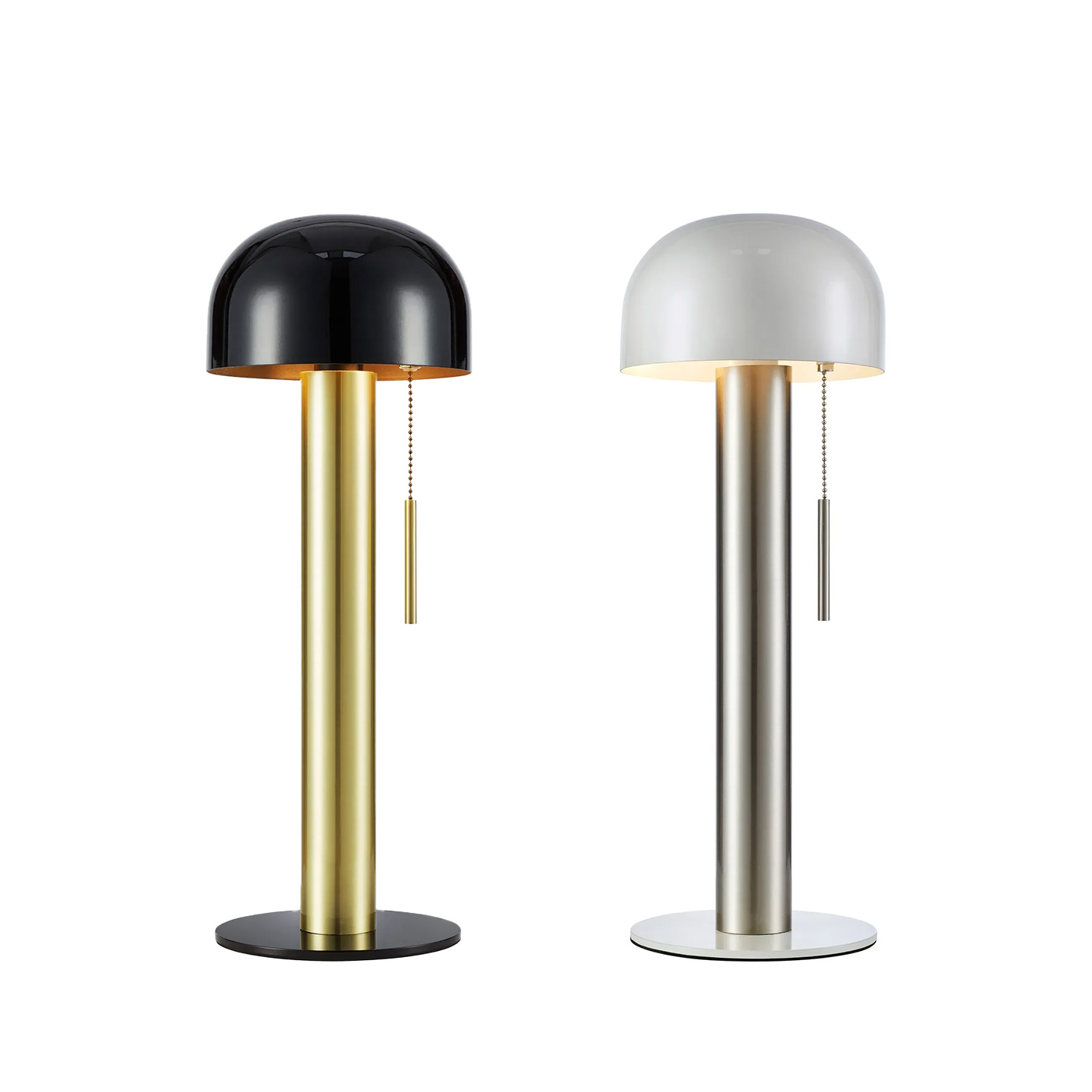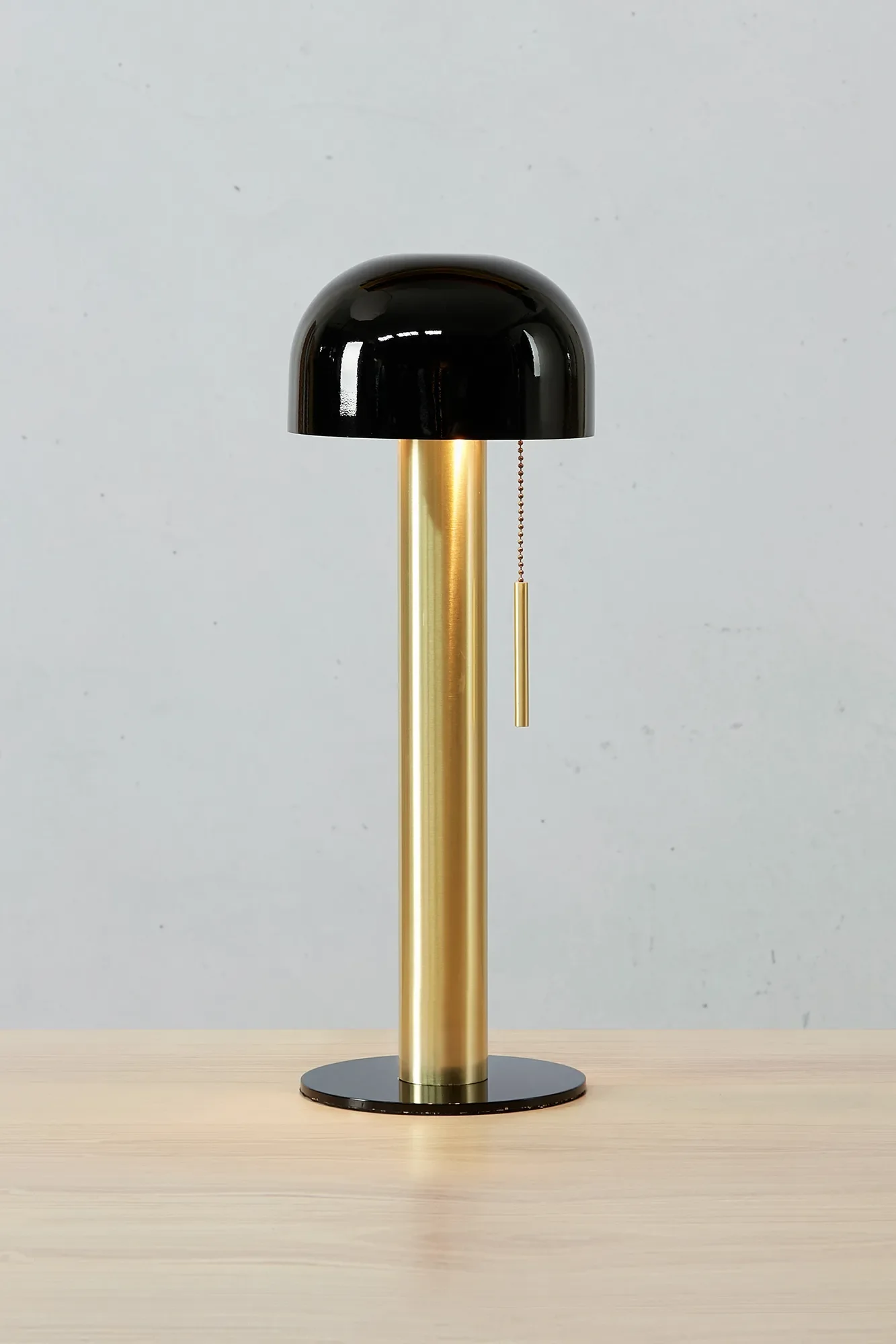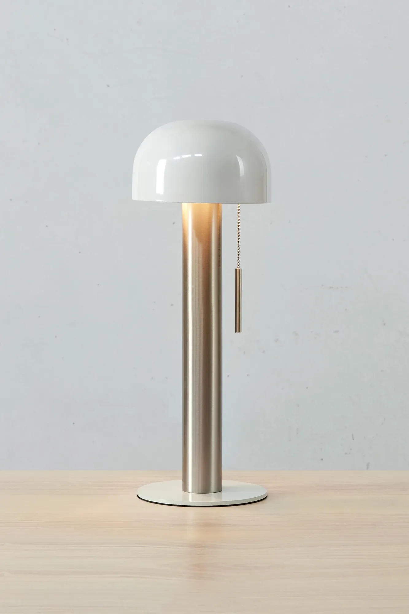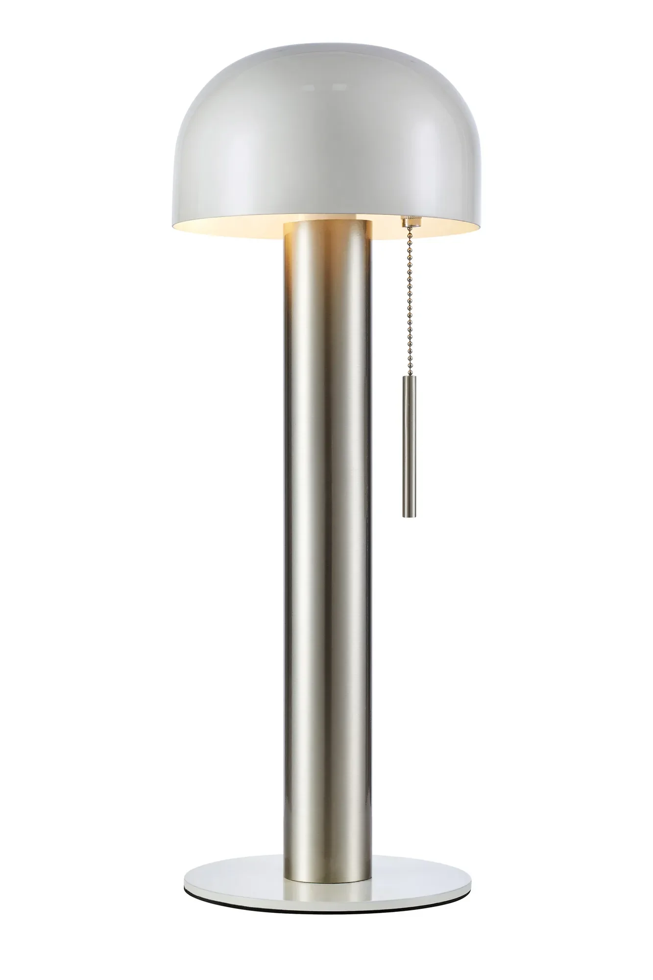 Bordslampa som kombinerar runda former med raka linjer, och en dragströmbrytare som ger en touch av retro. En stilfull inredningsdetalj som sprider ett behagligt ljus.
