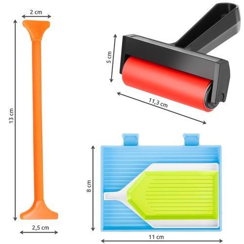 Diamantbroderisats är fylld med praktiska tillbehör, innehållande bland annat en rulle för att pressa fast diamanterna och hjälper till att fästa dem och jämna ut ytan som täcks med dem.