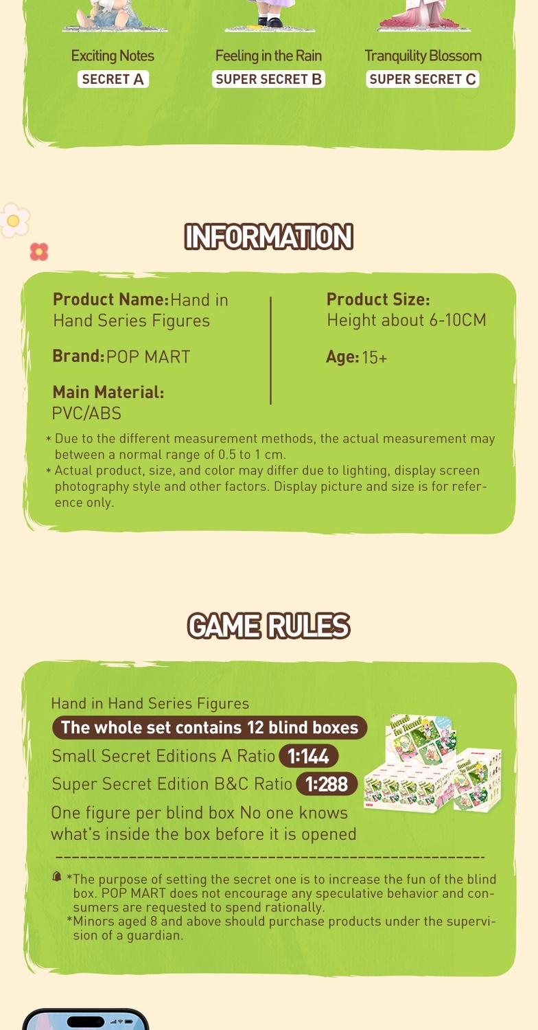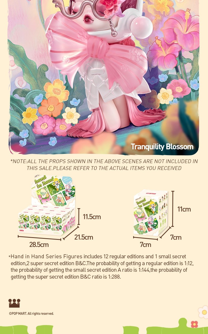 POP MART Hand in Hand-serien: Blindboxen innehåller en slumpmässig figur från en specifik serie. Varje blindbox innehåller bara en figur. Ingen, inklusive vi, vet vad som finns inuti. Denna kollektion innehåller 12 blindboxfigurer, varav en kan vara den hemliga utgåvan.