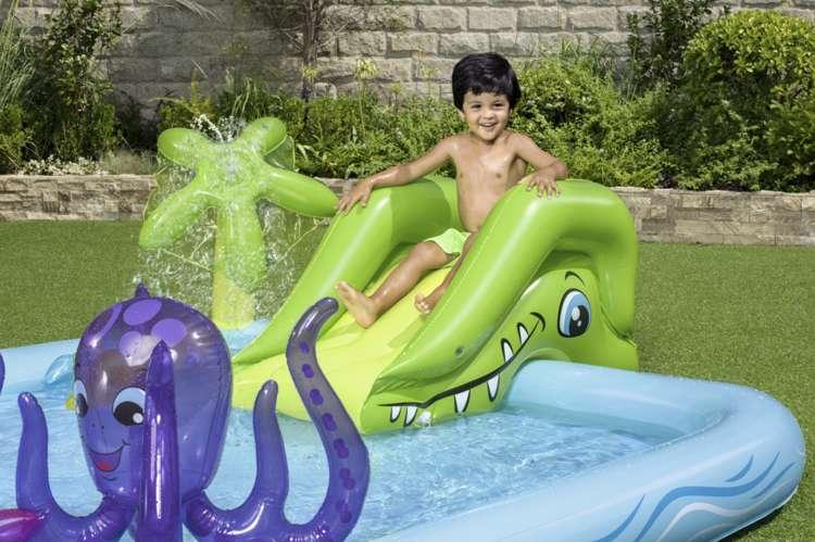 INTERAKTIV LEKPLATS - en plats skapad för fantastiskt kul utomhus. Dess form liknar ett akvarium som är karakteristiskt för undervattensvärlden. Attraktionen av poolen är en avtagbar uppblåsbar rutschkana, såväl som uppblåsbara havsdjur. På hörnet finns en palm som sprutar vatten från när trädgårdsslangen kopplas.