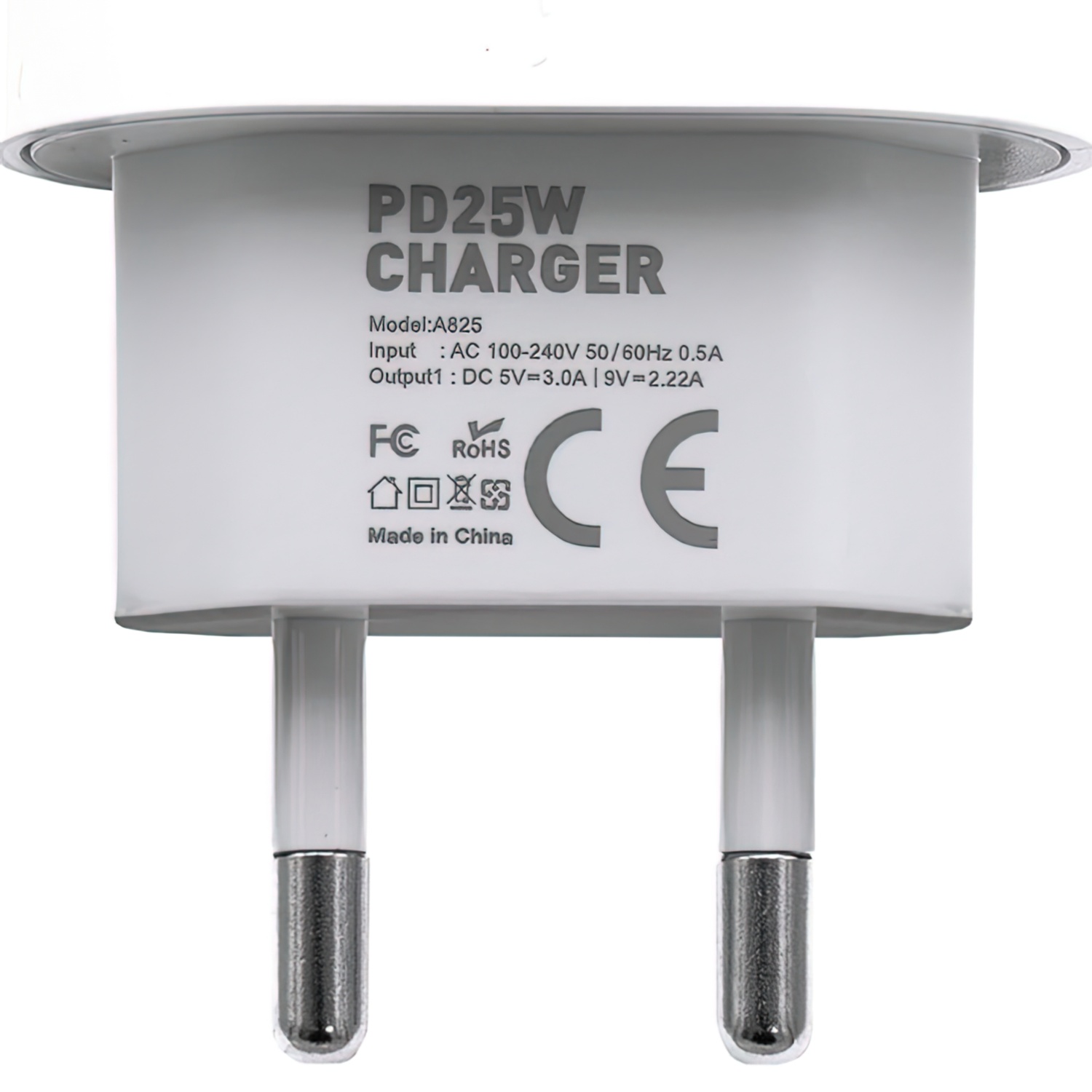 Snabbladdare med 25 W effekt och USB-C-utgång, kompatibel med flera märken.