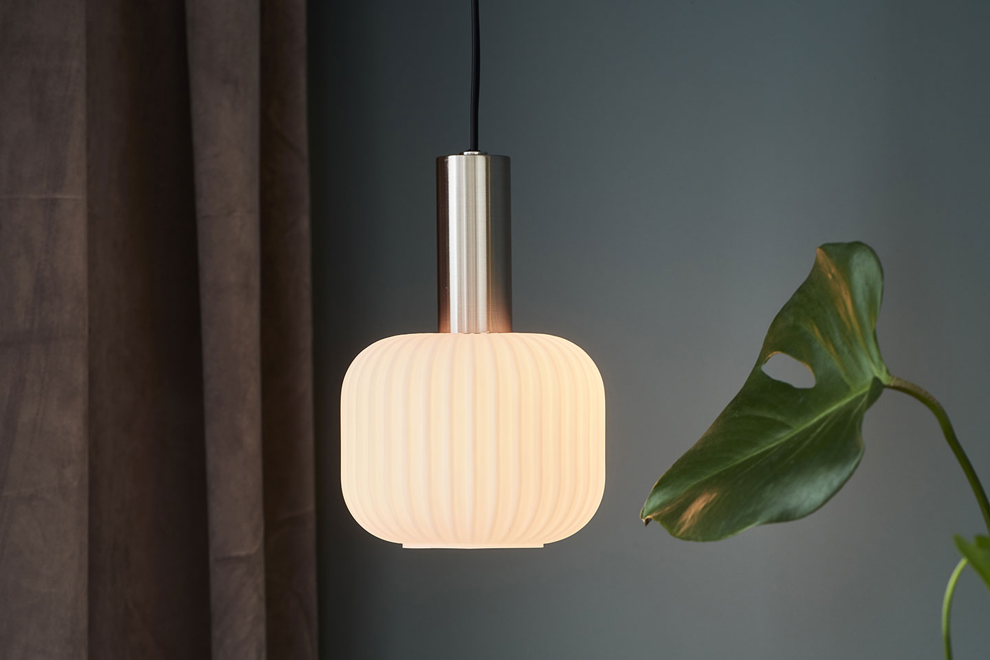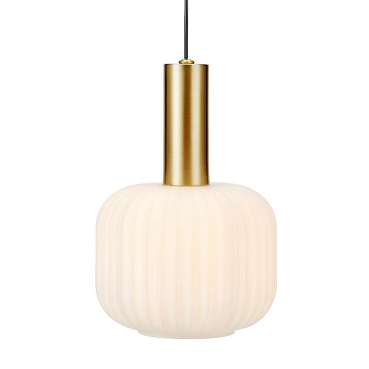 Sober liten pendel från Markslöjd i borstad mässing och vit glasskärm. Denna stilrena och eleganta lampa passar perfekt att ha i t.ex. fönstret för att lysa upp din vardag.