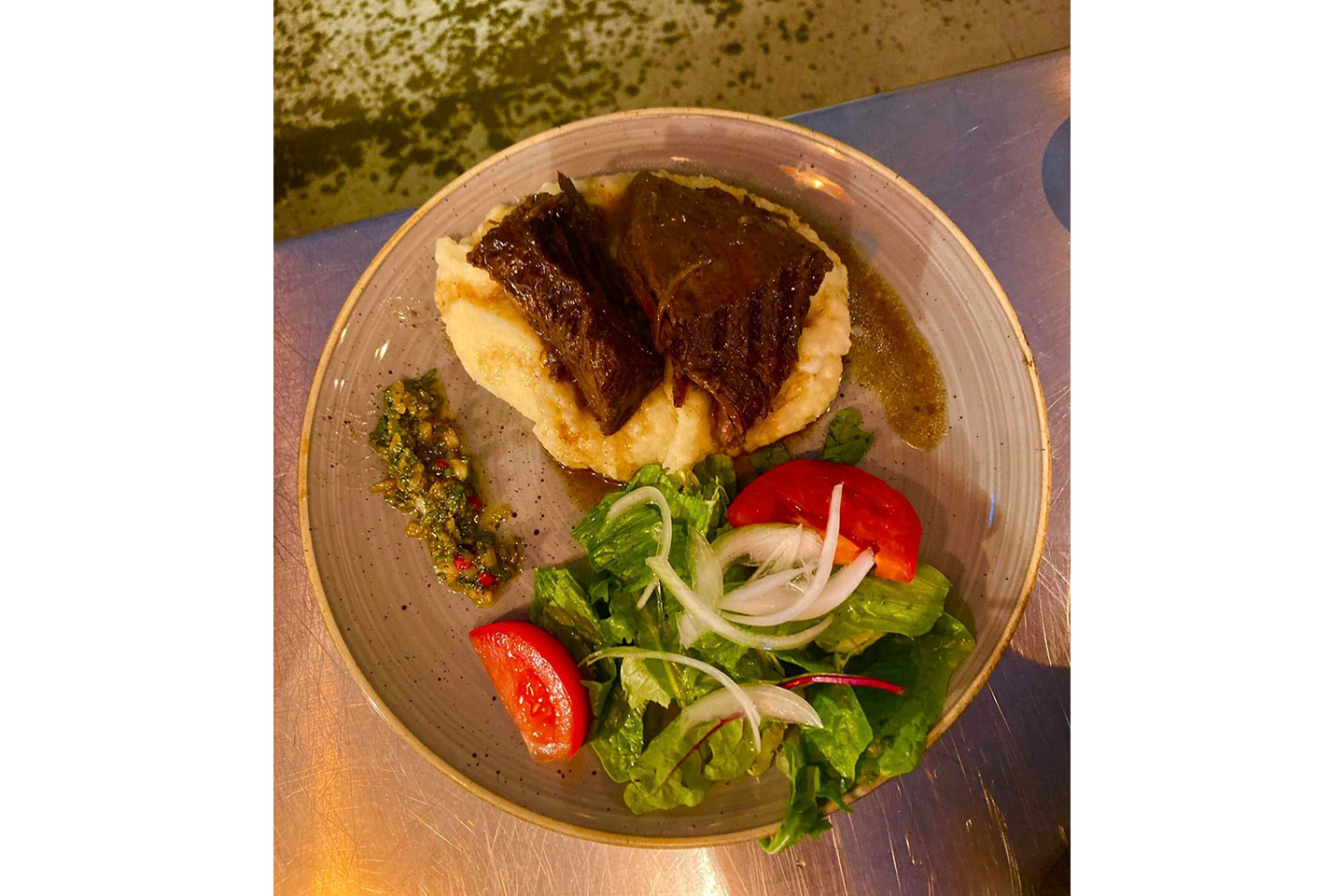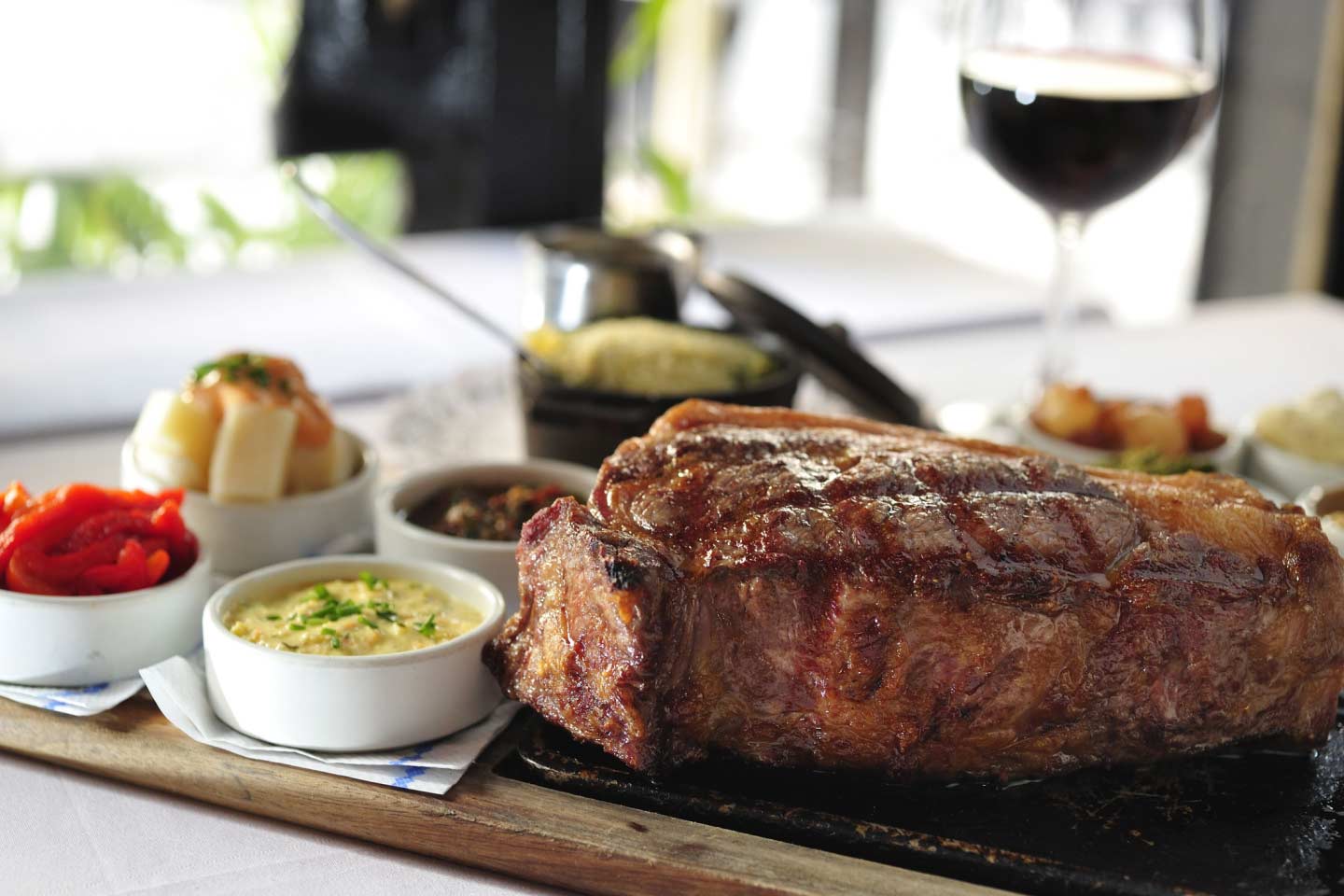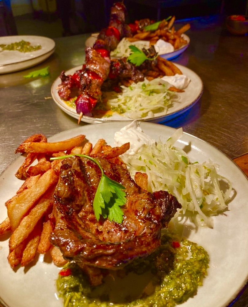 Grillad entrecote serverad med egengjorda pommes och husets såser