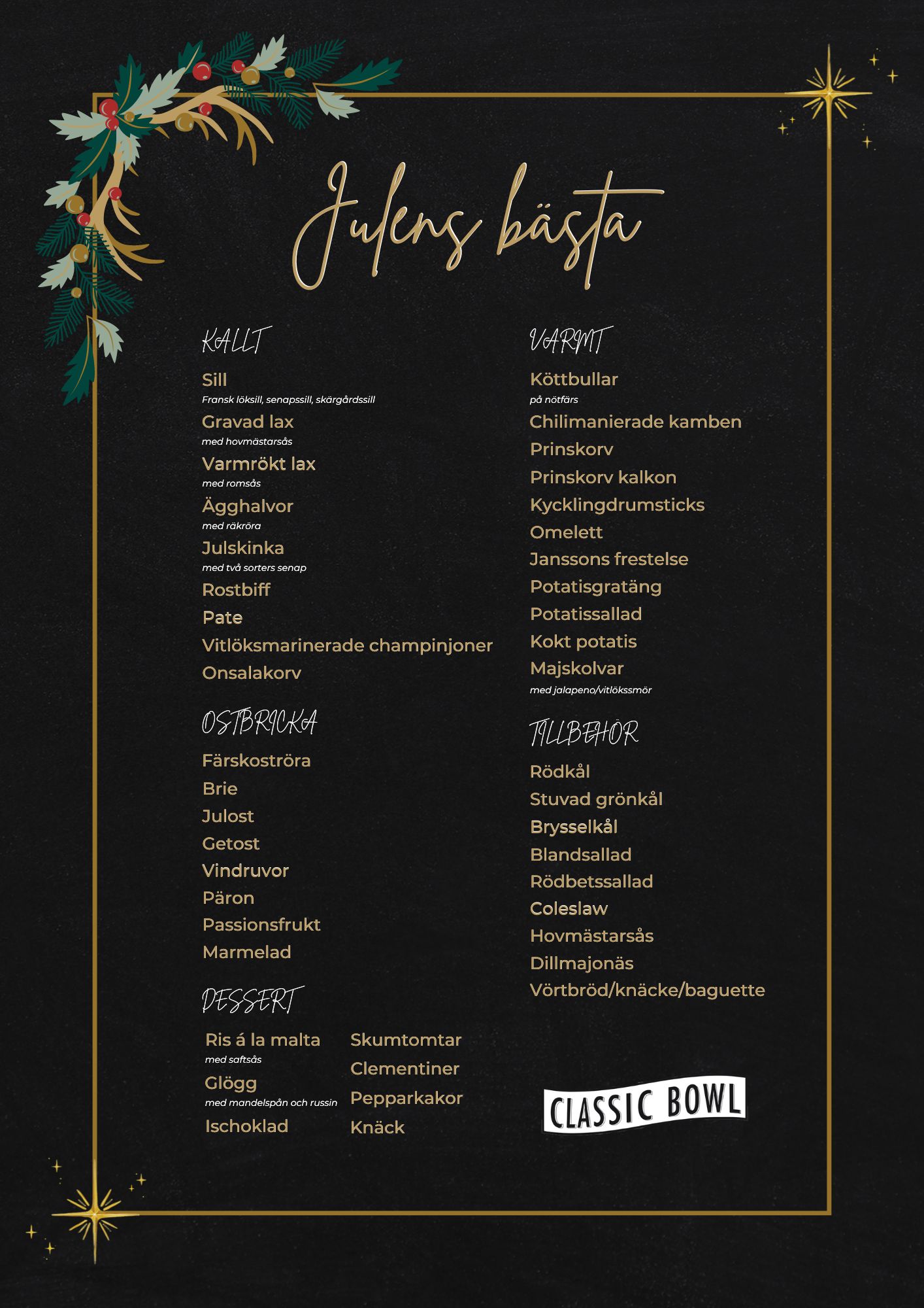 Kanske årets roligaste julbord? På Classic Bowl kombineras det traditionella julbordet med discobowling. Ta med vänner och familj och se vem som slår första strike! Och njut av sill, ägghalvor, julost, Janssons frestelse, Ris á la Malta och mycket mer...