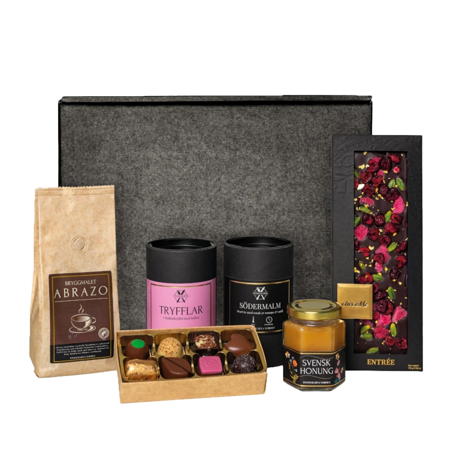 Finsmakarlådan Premium från Finsmakarna är en generöst fylld presentbox med noggrant utvalda delikatesser, allt samlat i en stilren och lyxig förpackning. Perfekt att ge bort vid firanden, som tackgåva eller bara för att visa uppskattning till någon som älskar det lilla extra. Innehållet är handplockat för både matälskaren och finsmakaren.