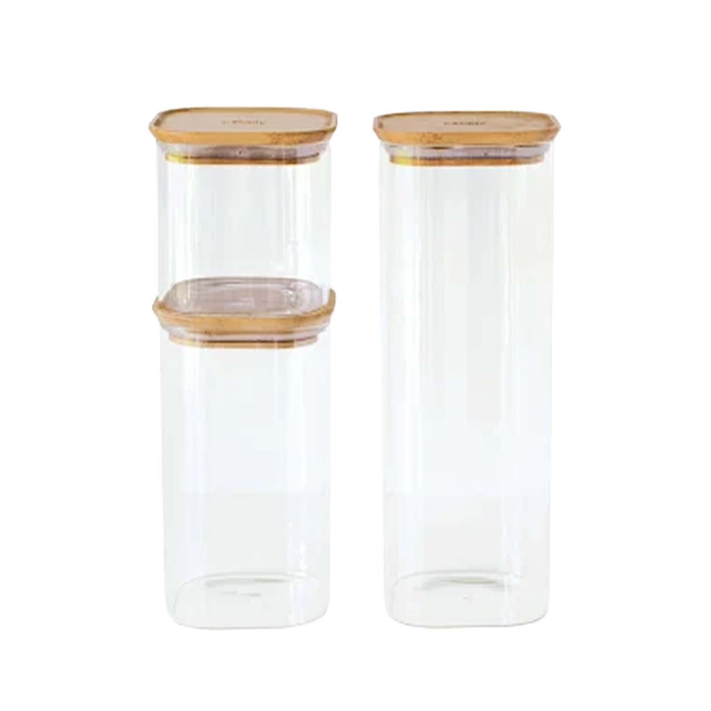 Organisera köket med stil med detta 3-delade set från Pebbly. fyrkantiga glasburkar i borosilikatglas med lufttäta bambulock, perfekta för torrvaror som gryn, mjöl, kaffe och snacks. Formen gör burkarna enkla att stapla och yteffektiva, lika snygga på öppna hyllor som i skåpet.