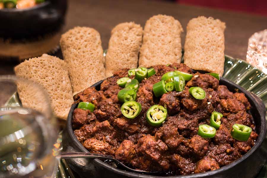 Alla rätter serveras med Injera (En pannkaka som surdegsbröd) och sallad