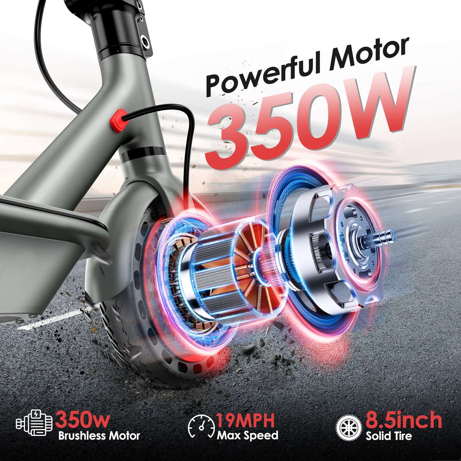 Elscootern har en elegant, mörkgrå yta och har robusta, 8.5-tums honeycomb däck som ger dig bekväm körning även i ojämn terräng.