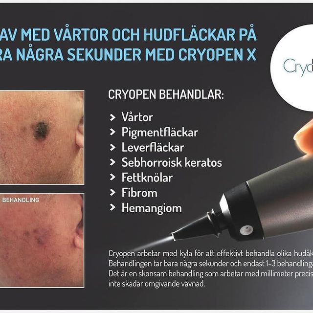 Behandlingen görs med Cryopen som är en effektiv frysbehandling som snabbt och enkelt hjälper dig bli av med hudfläckar som pigment, åldersfläckar, vårtor och fettknölar. Med Cryopen kan det räcka med en till två behandlingar för att permanent bli av med fläckarna.