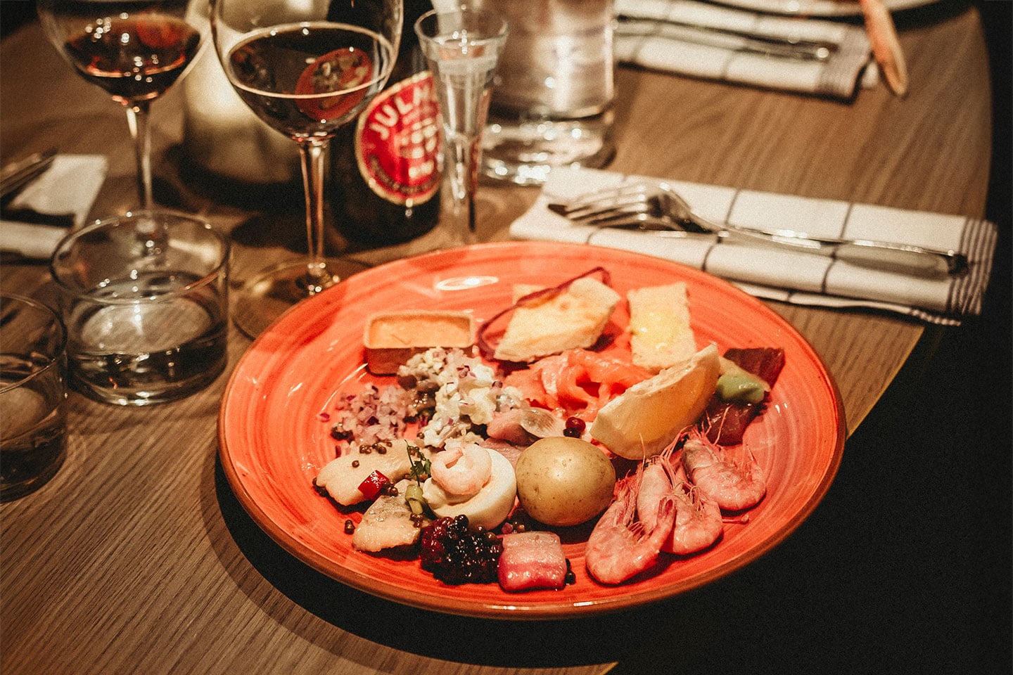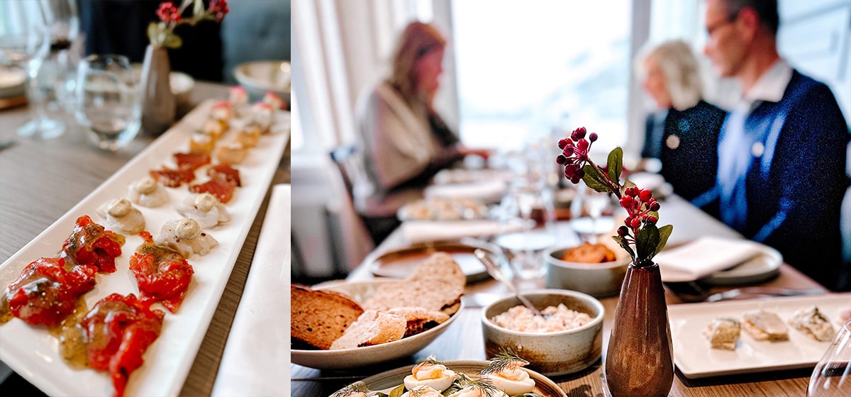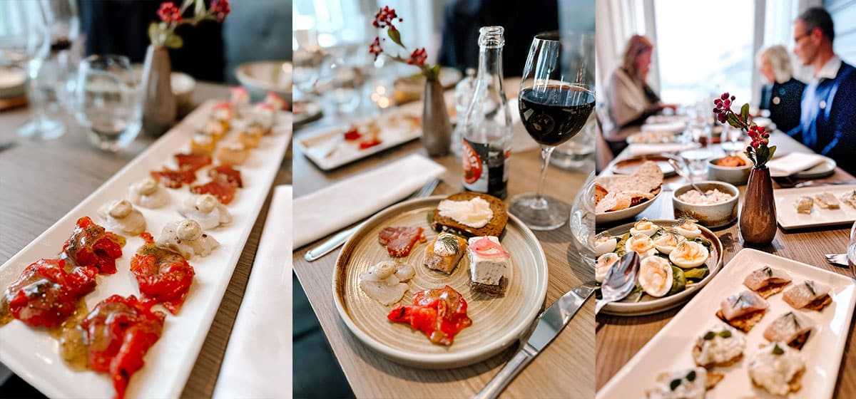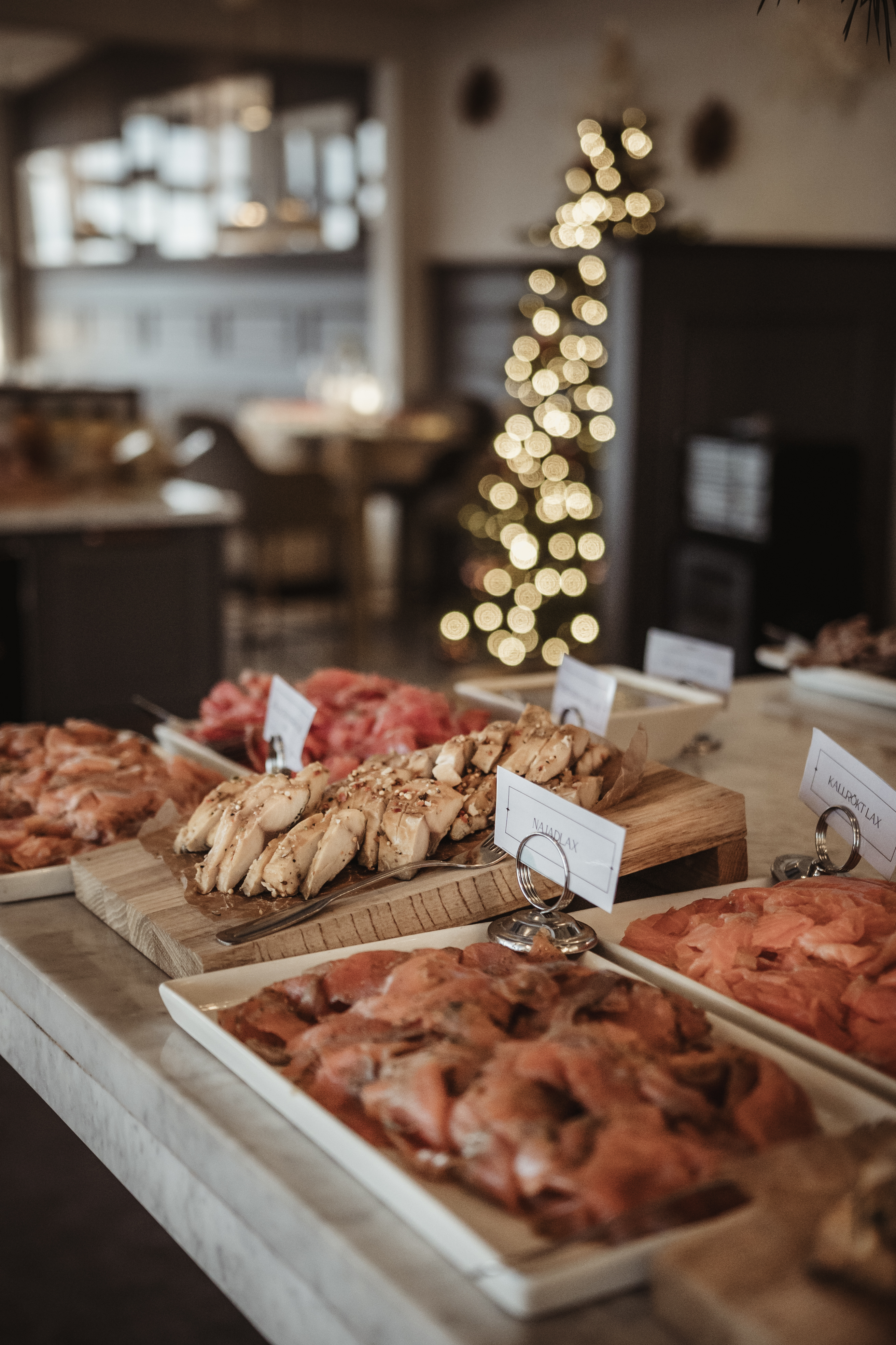 Julbordet på Smögens Hafvsbad bjuder på en modern tolkning av klassiska julrätter. Det kalla serveras som buffé, medan det varma kommer till bordet i ett sharingupplägg där du väljer dina favoriter. Kvällen avrundas med ett dessertbord fyllt av godsaker - från hemlagade desserter till julgodis. Allt ackompanjeras av stämningsfull musik och doften av jul vid havet.