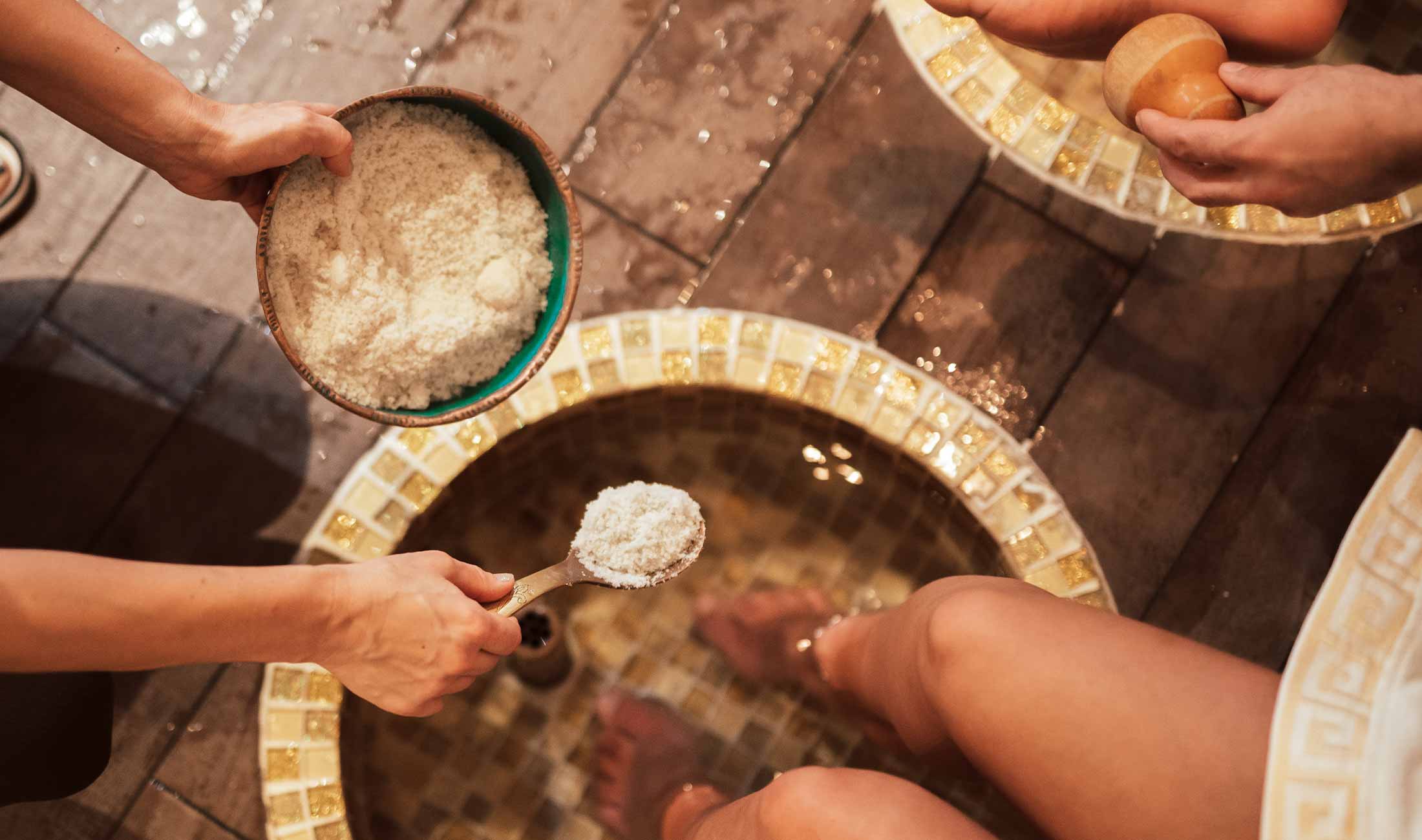 Sittandes på marmorbänken får du en inledande uppmjukning av fötterna. Sedan ett fotbad som spetsas med de finaste salter samt behandling för att få fart på cirkulationen. -