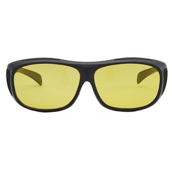 Svarta solglasögon med gult “night-vision” glas som kan användas ovanpå andra glasögon eller läsglasögon. Skydda dina ögon från UV-strålning samtidigt som du kan bära dina vanliga glasögon med styrka!