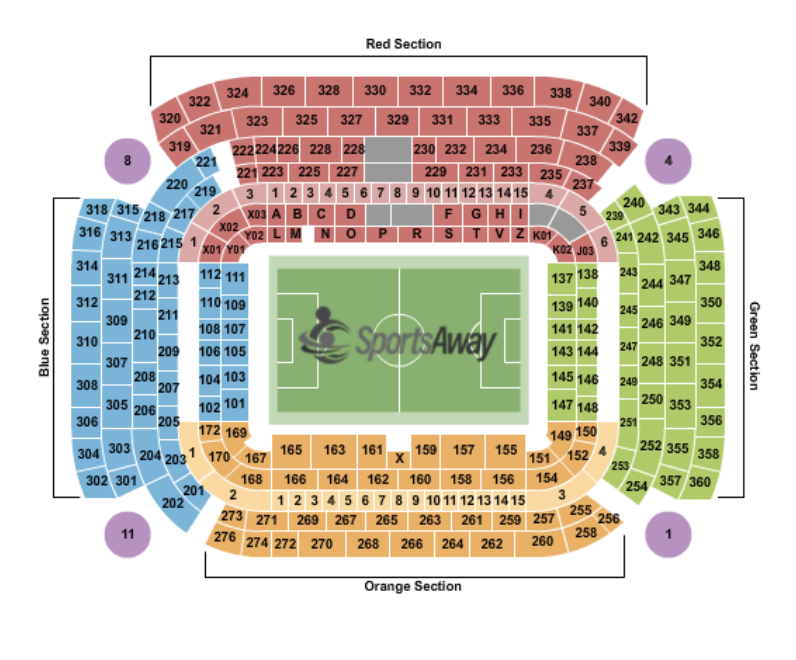 - Långsida ring 3 (område röd på kartan - sektioner som börjar på 3xx) - upp till 8 biljetter garanteras bredvid varandra