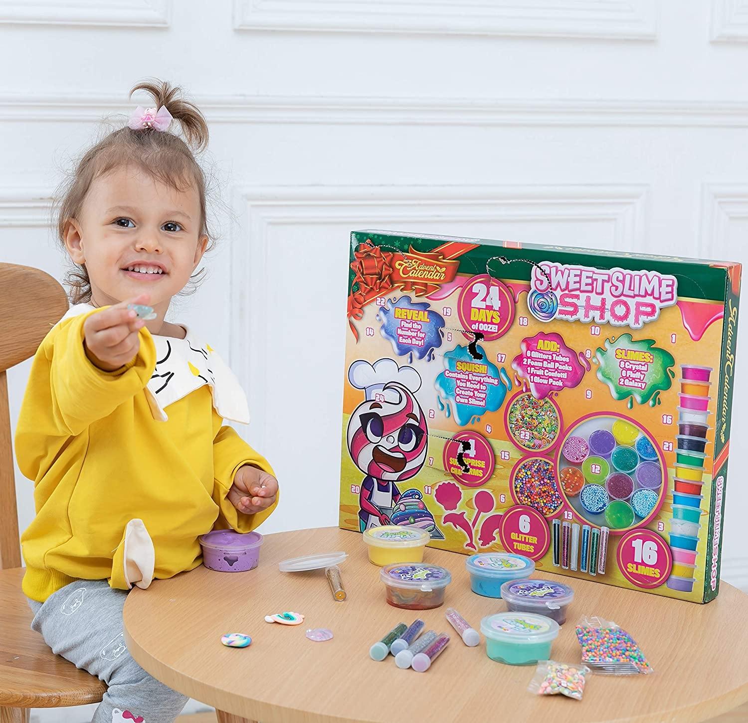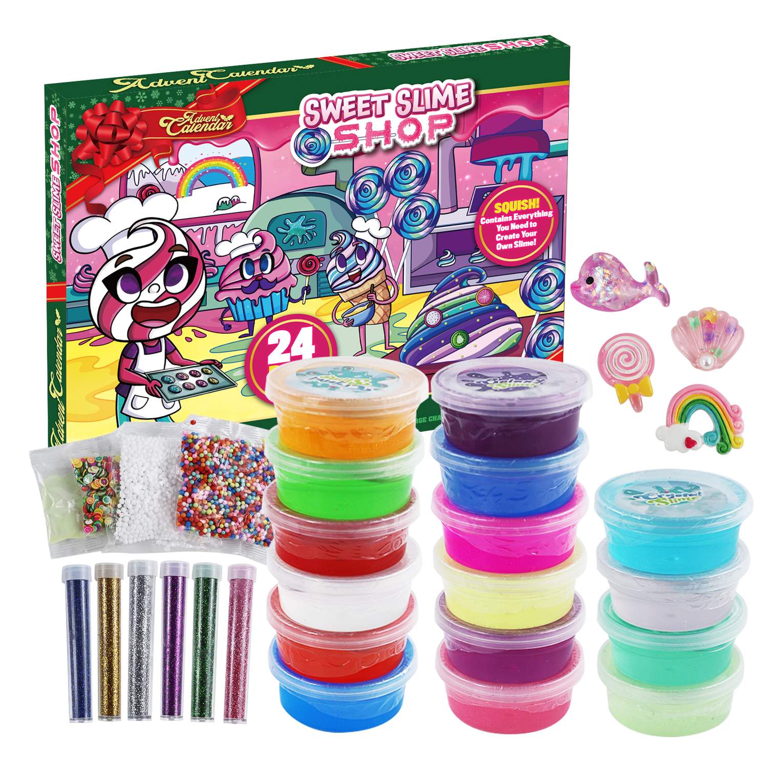SUPER VALUE PACK. Vår adventskalender innehåller 24 dagars nedräkning av olika slime/slajm samt tillbehör, 6 Galxy Slime (Mörk Lila, Blå, Rosa, Gul, Lila, Rosa), 10 Crystal Slime (Orange, Grön,