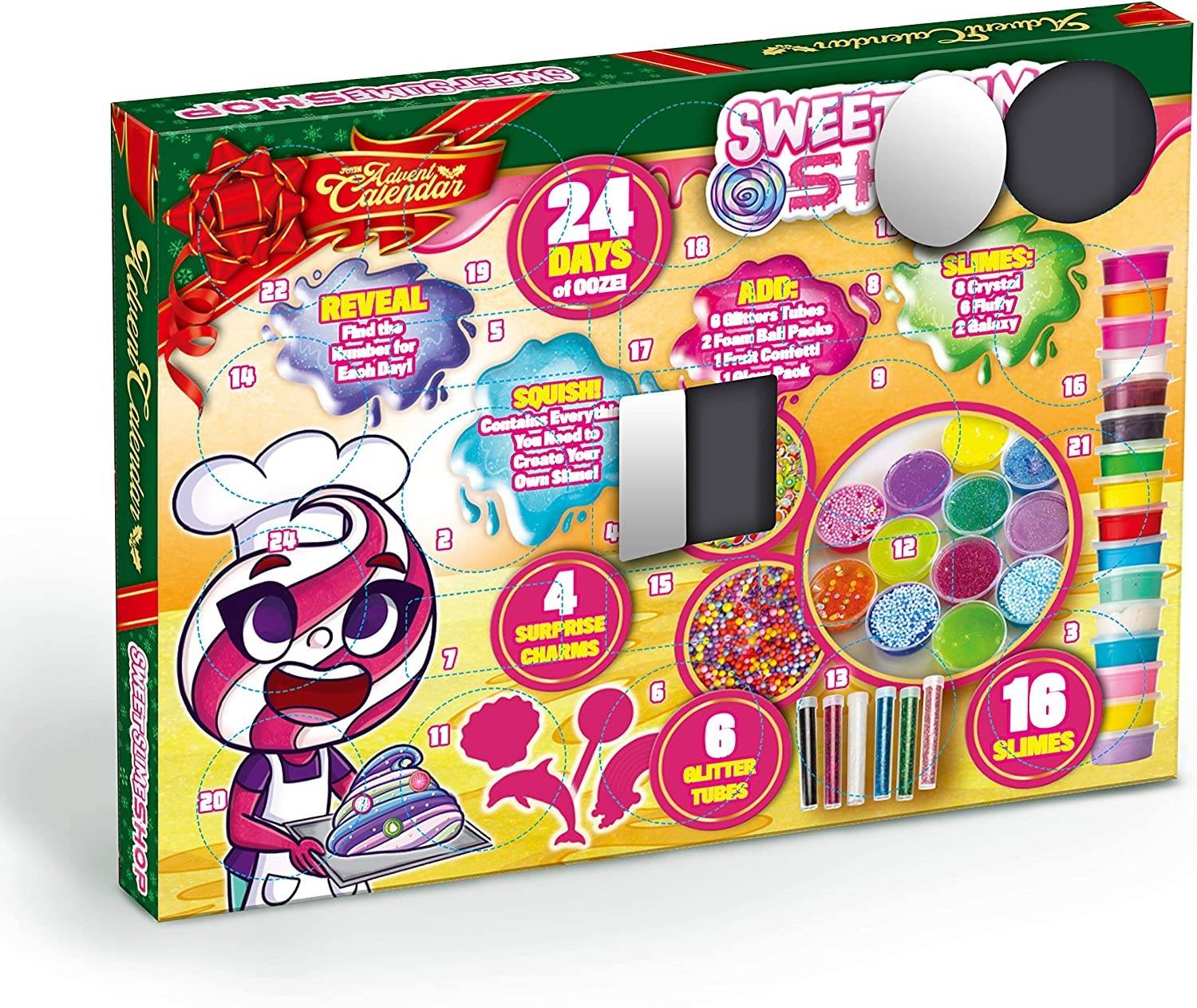 SUPER VALUE PACK. Vår adventskalender innehåller 24 dagars nedräkning av olika slime/slajm samt tillbehör, 6 Galxy Slime (Mörk Lila, Blå, Rosa, Gul, Lila, Rosa), 10 Crystal Slime (Orange, Grön, Mörk Röd, Vit, Röd, Blå, Turkos, Lime, Genomskinlig Klar, Grön), 6 glitterrör (guld, lila, blå, silver, rosa, grön), 1 påse skumbollar, 1 påse fruktskivor, 1 påse med Soft Clay Decor, och 1 påse Glow in the Dark Powder.