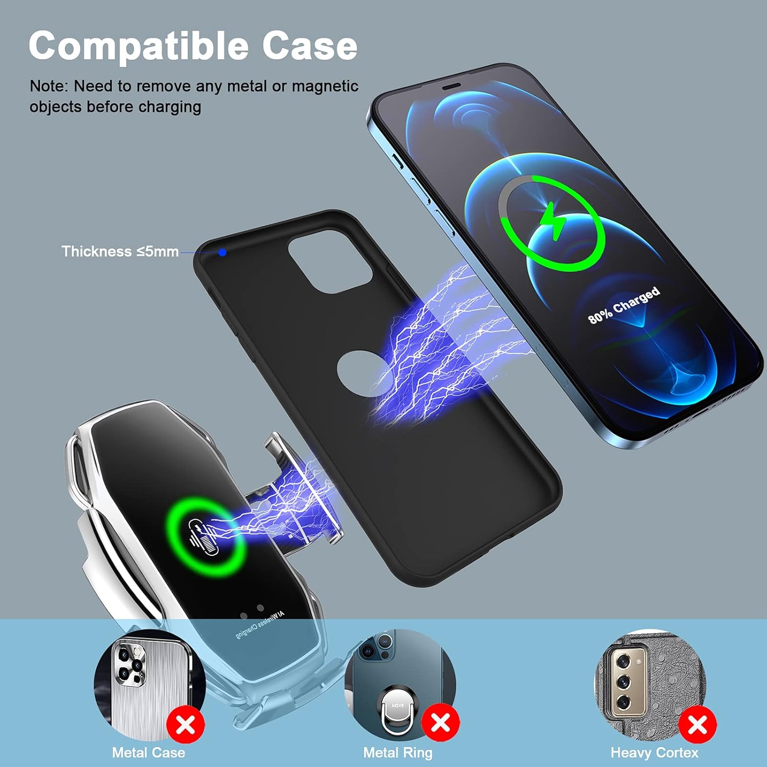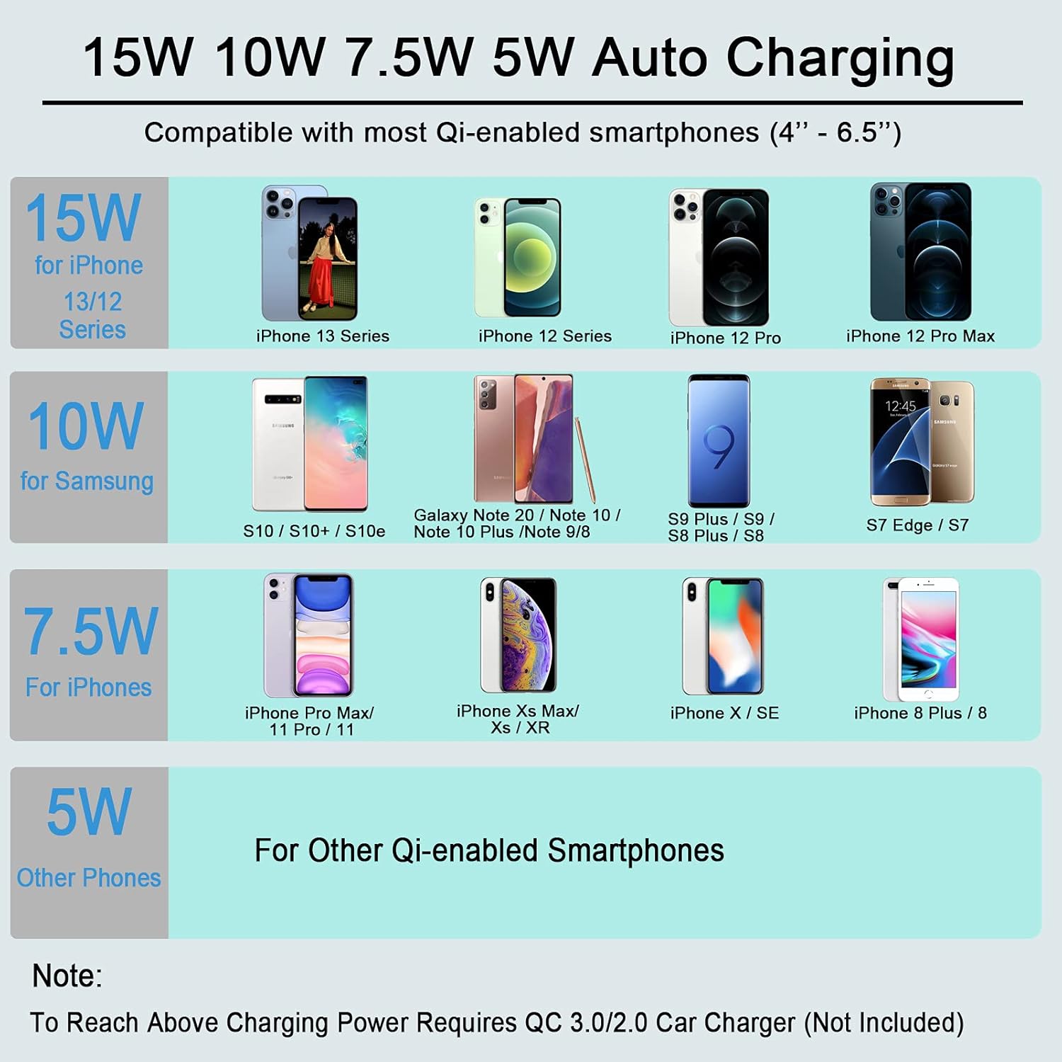 - Stöd för 15W, 10W, 7.5W och 5W trådlös laddning – kompatibel med iPhone 13/12/11/X/8-serier och andra QI-aktiverade enheter.