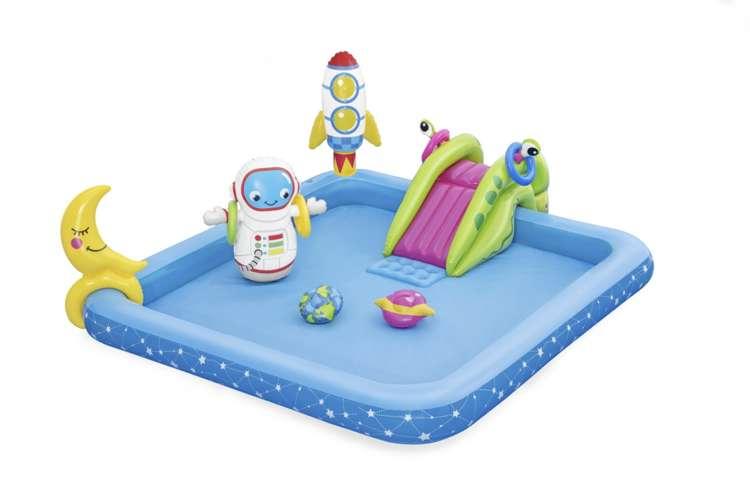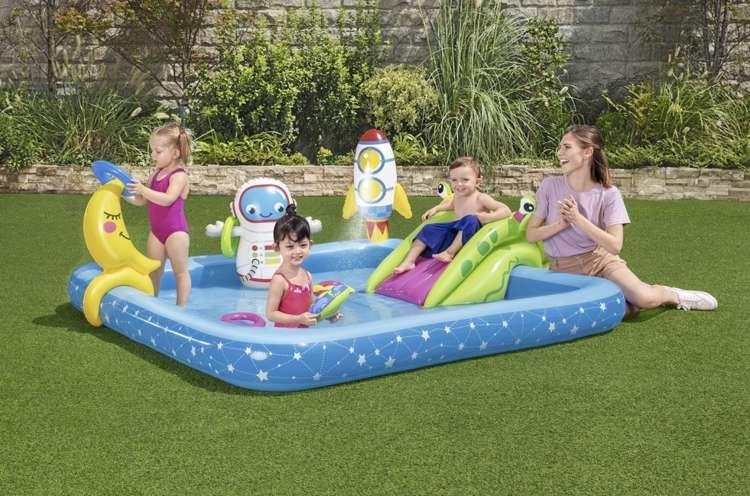 Den uppblåsbara vattenparken har många attraktioner, inklusive lekpool, vattensprinkler, prinsar att kasta ringen, rutschkana med en mjuk dyna, frisbee.