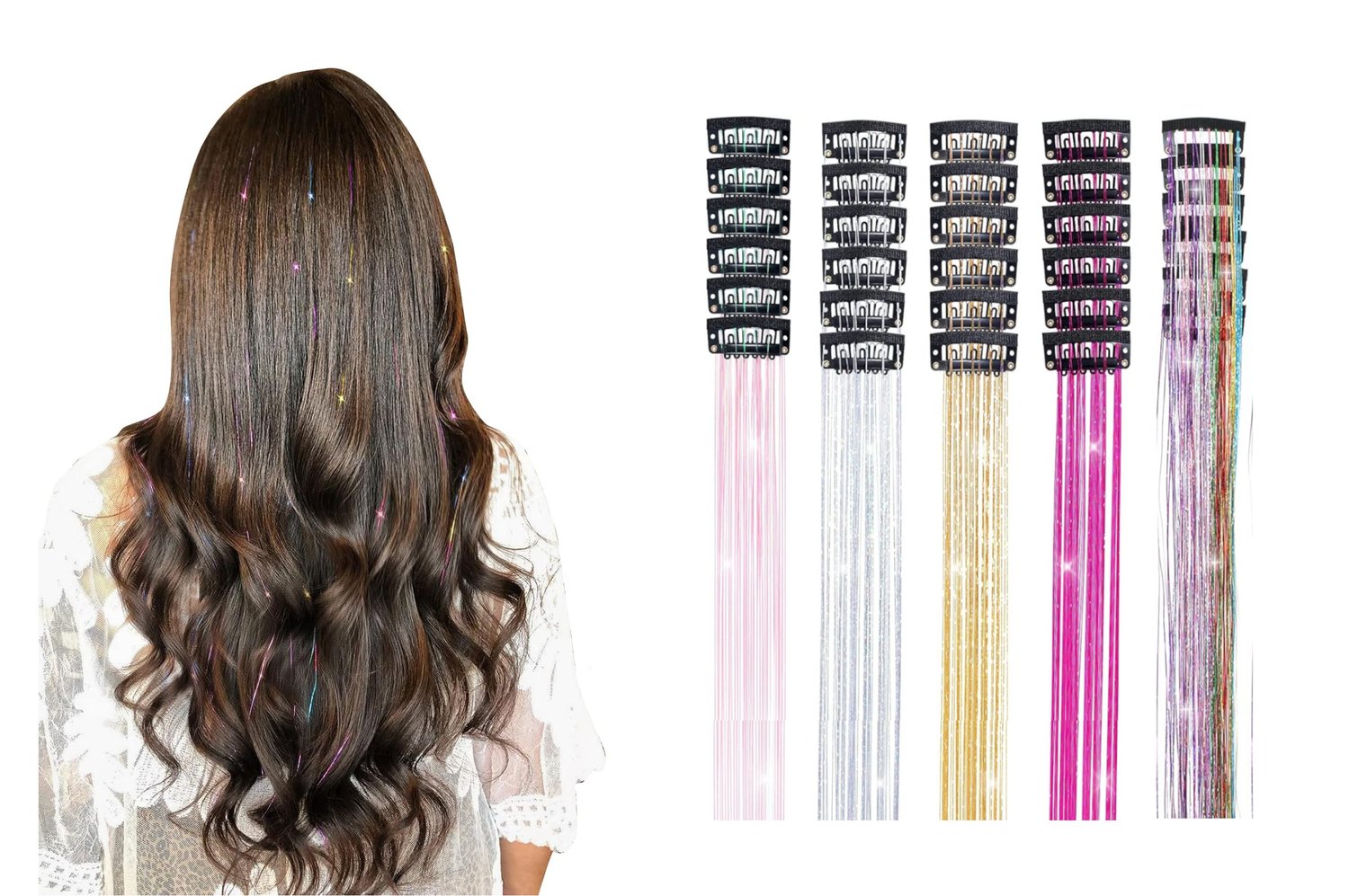 Färgglada clip-in hårförlängningar med slingor – 6-delars set