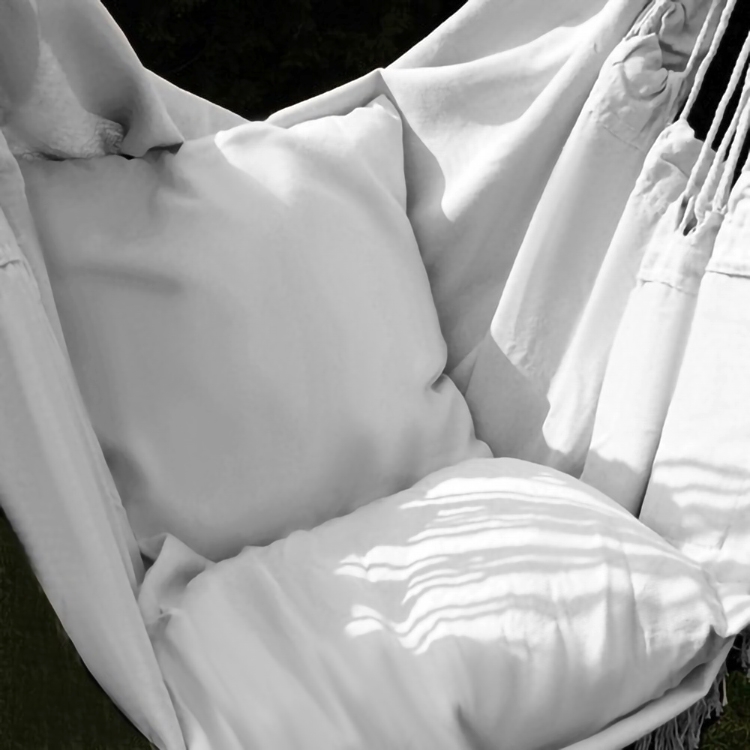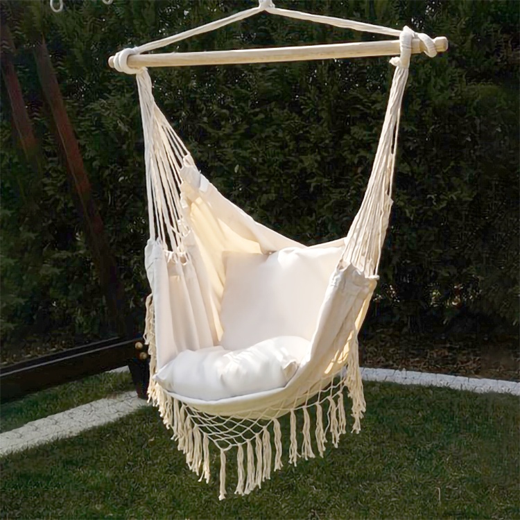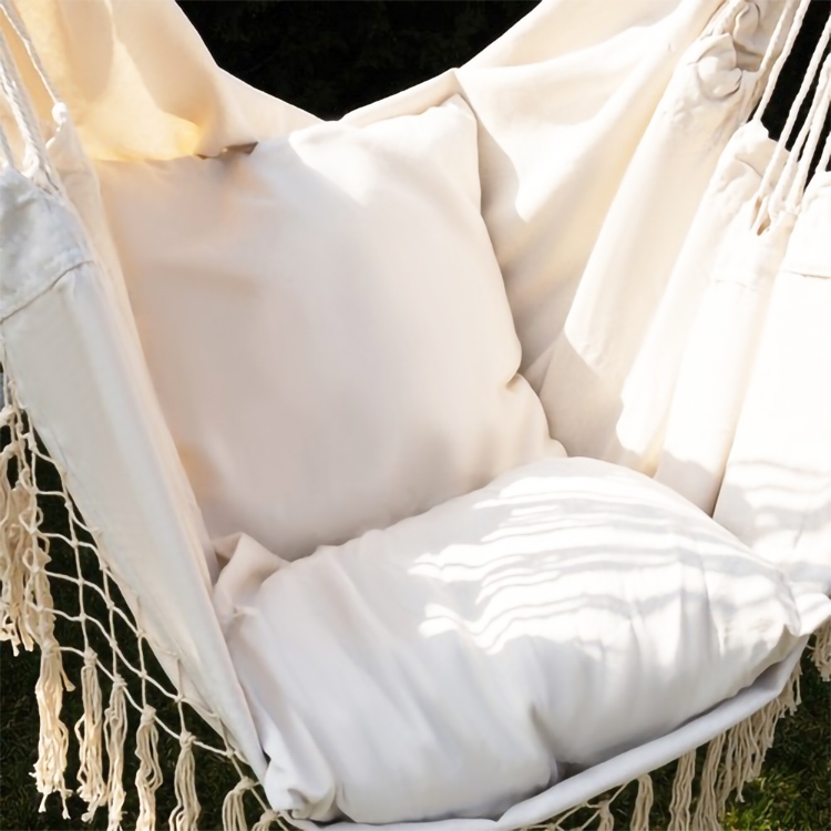 Bekväm hängstol i bomull med två kuddar, perfekt för trädgård, terrass eller balkong.