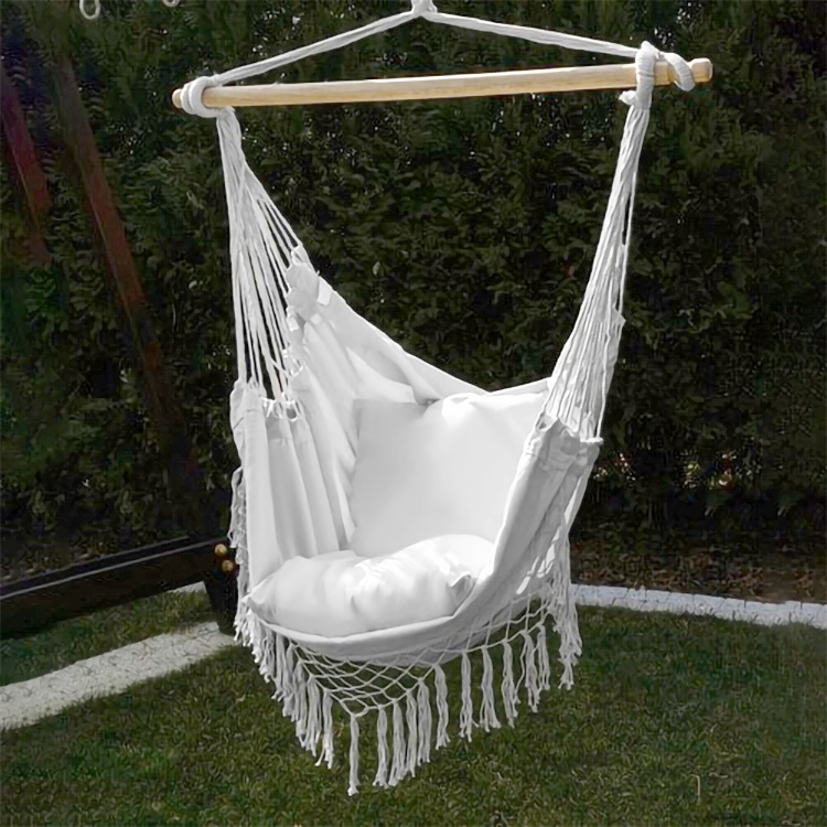 Njut av avkopplande stunder i denna bekväma och stilfulla hängstol från Gardlov. Tillverkad av mjuk bomull förstärkt med polyester kombinerar stolen komfort och slitstyrka perfekt. Den stabila träpinnen och de jämnt fördelade repen säkerställer en trygg och balanserad upphängning som förhindrar vridning och ökar hållbarheten. Hängstolen klarar en maximal belastning på 120 kg och levereras med två bekväma kuddar som ger extra stöd och avslappning. Med en rymlig sits och robust design är den ett utmärkt val för både inomhus- och utomhusbruk – perfekt för trädgården, balkongen eller vardagsrummet.