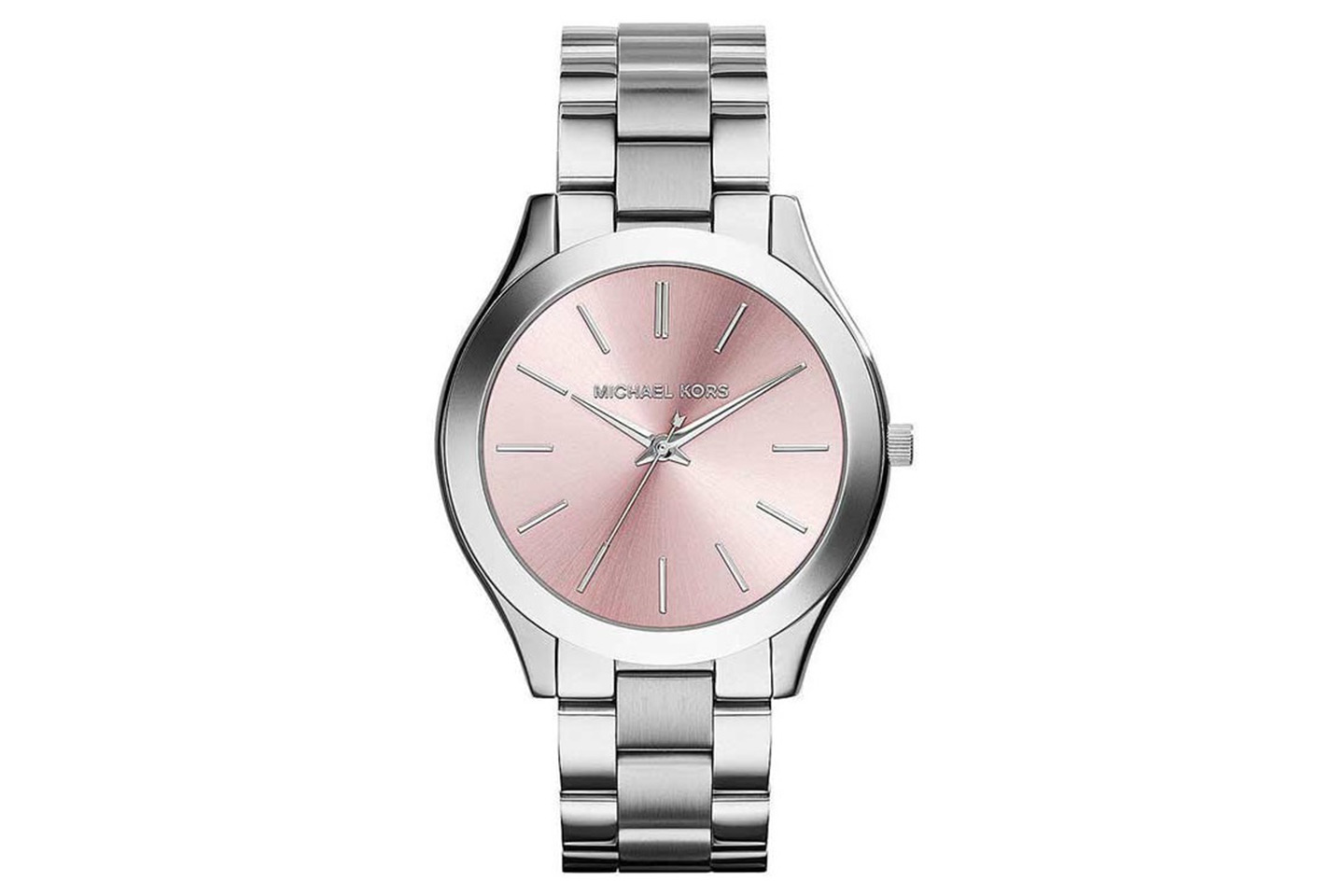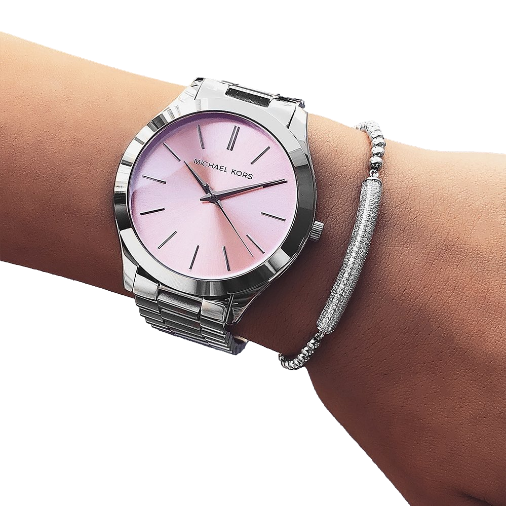 Låt denna moderna och stilfulla klocka från Michael Kors förgylla din vardag. Klockan har ett armband i silver och ett urverk i rosa, en match made in heaven.