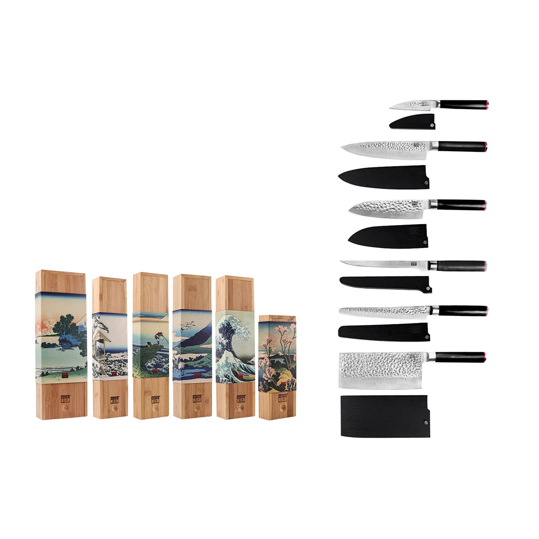 Bli en mästerkock i köket med knivset bestående av 6 delar köksknivar i bra kvalitet: Skalkniv, Gyuto (kockkniv), bröd-/konditorkniv hamrat blad, filékniv och Chinese Cleaver.