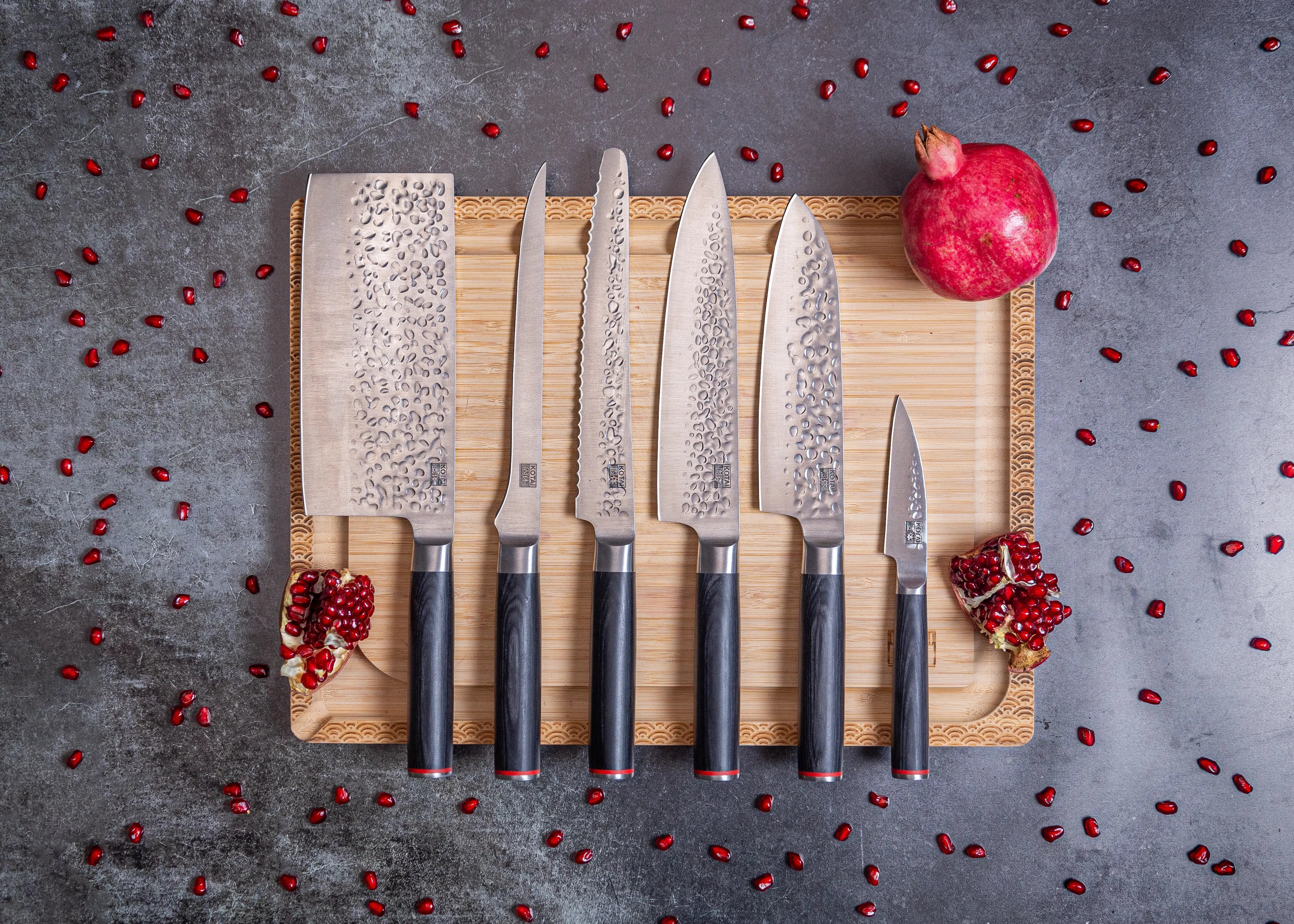 Smidda med japanskt 440C rostfritt stål med hög kolhalt, kommer alla KOTAI-blad att hålla sig vassa upp till 10 gånger längre än andra knivar. 440C kombinerar en hög kolhalt för hårdhet och kanthållning med den optimala mängden krom för korrosionsbeständighet.