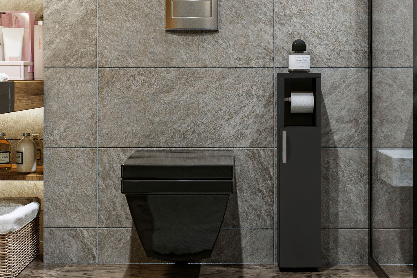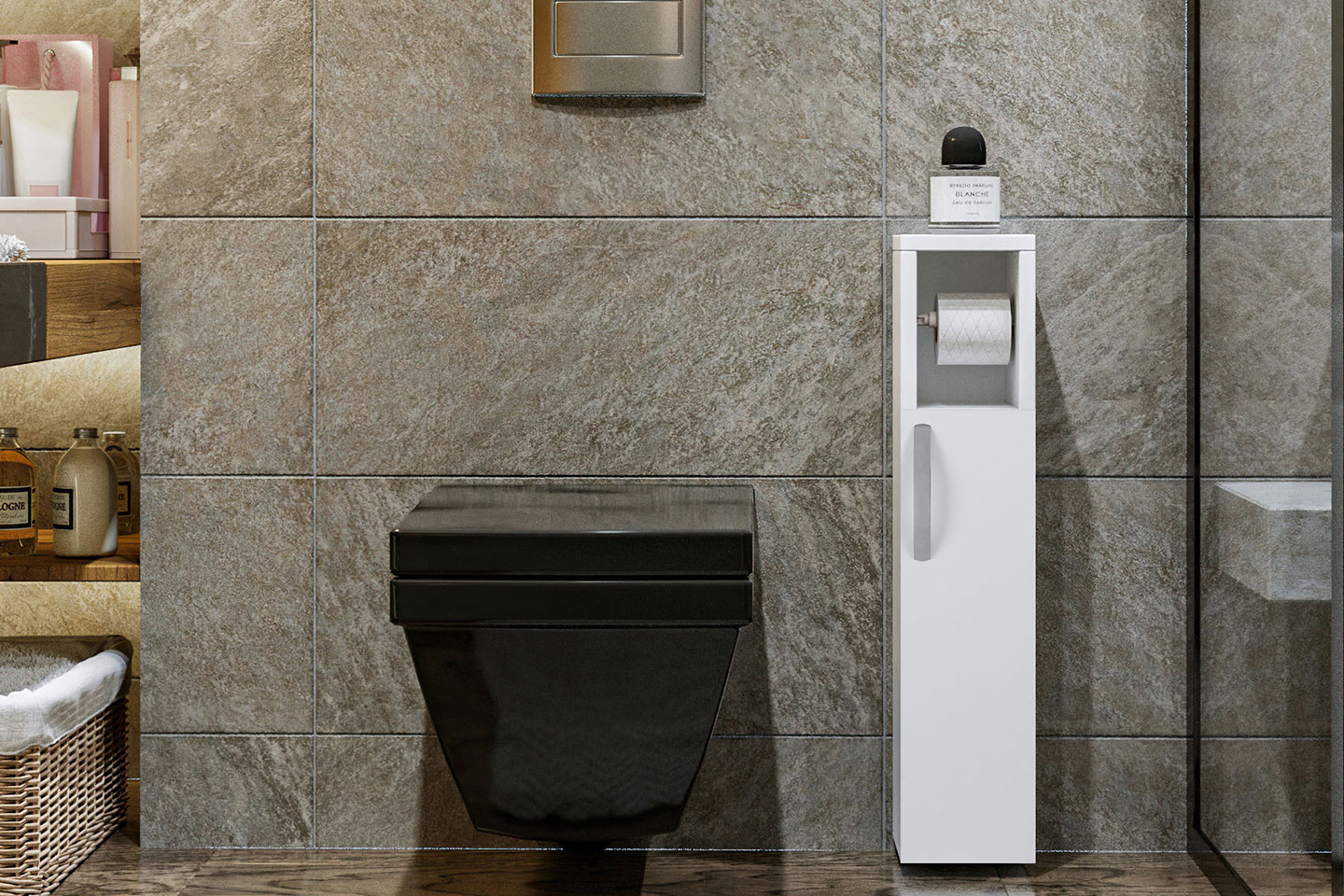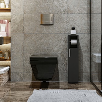 Stilrent badrumsskåp med praktiskt toalettrullehållare – perfekt förvaring för toalettpapper och mindre handdukar. Välj mellan ek, vit, eller anthracit.