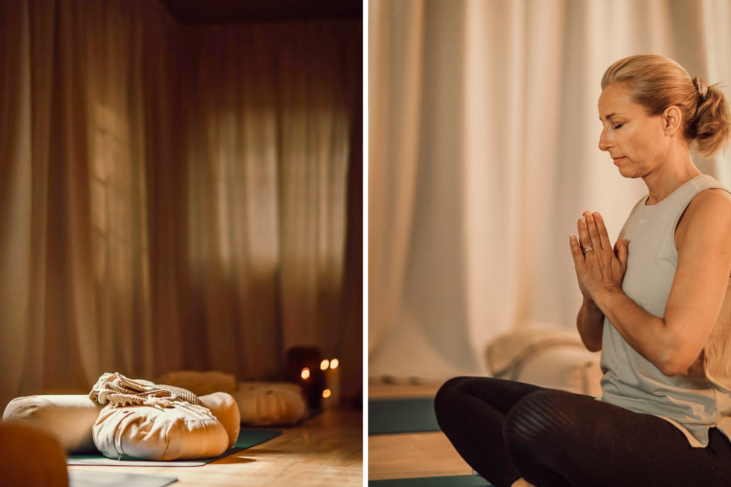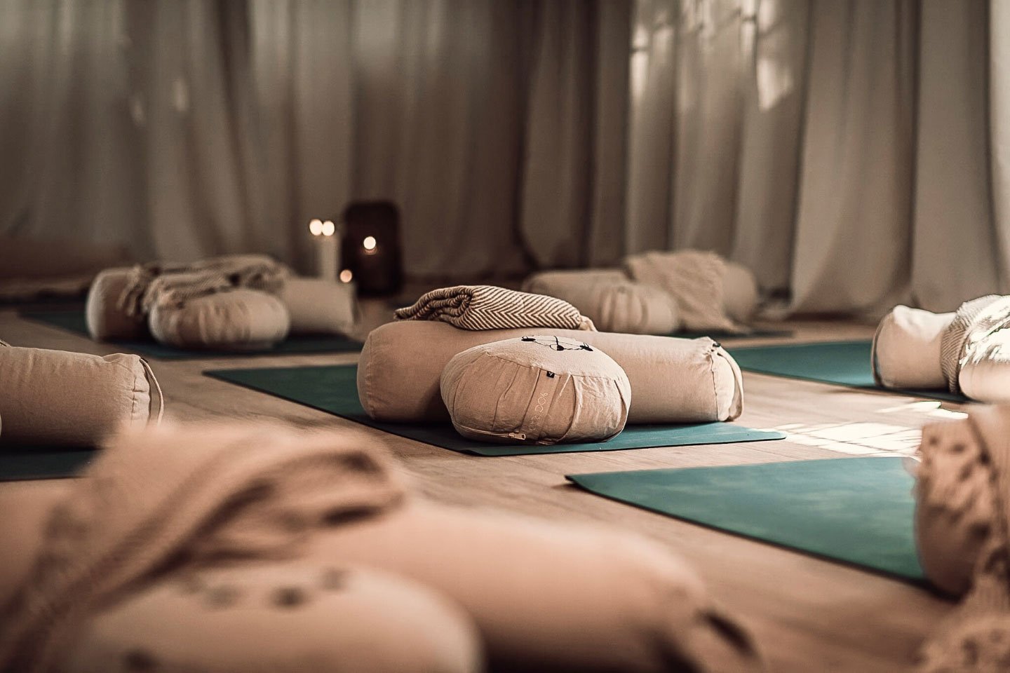 - Yogamattor, meditationskuddar, yogaklossar och bolster finns att låna på plats
