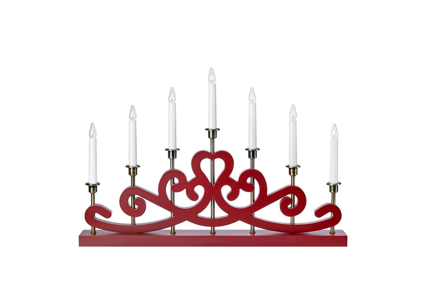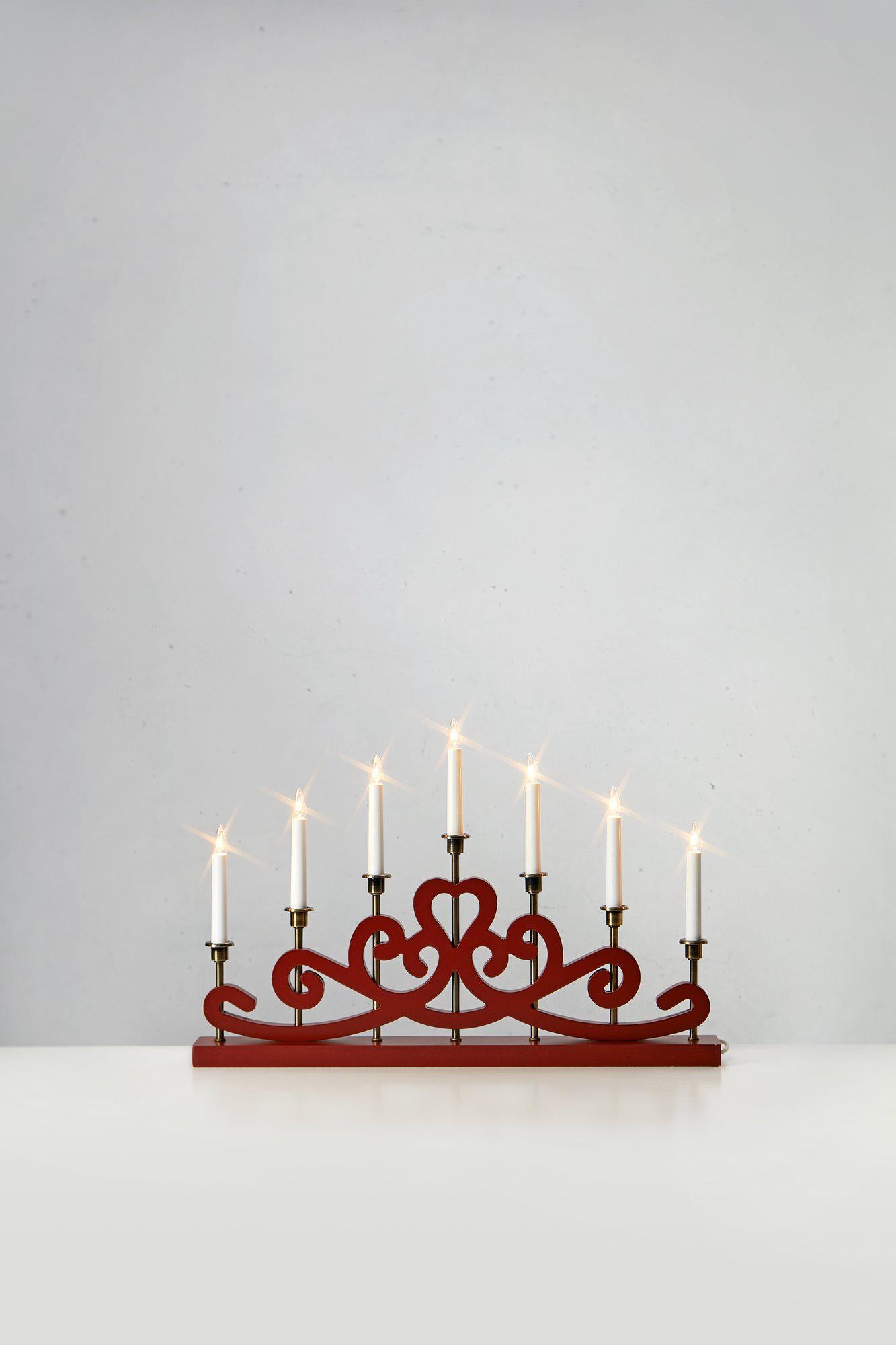 Nightfall är en röd ljusstake i trä med en romantisk känsla. Den sjuarmade adventsljusstaken har kromdetaljer som bidrar till en extra mysig atmosfär. Med en bredd på 62 cm passar den perfekt i köksfönstret.