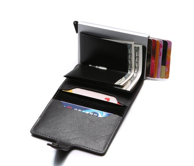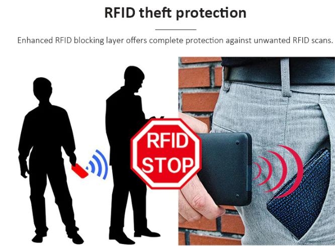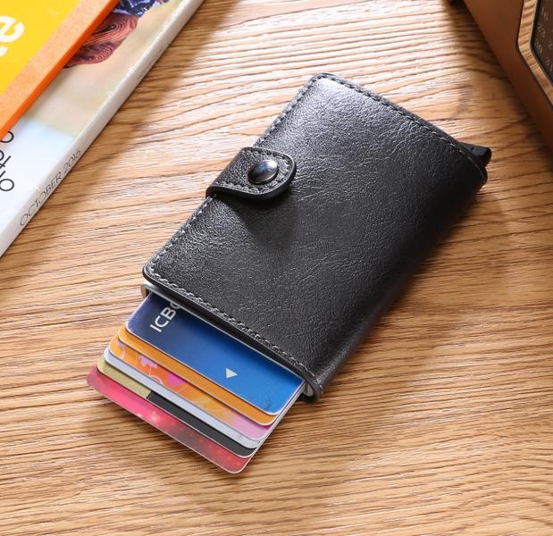 Korthållaren blockerar läsare från att scanna din identitet, kreditkort, bankinformation, körkort och andra rfid-kort. Samtidigt är det en bekväm lösning för att hålla de viktigaste korten och med knappen i botten glider korten enkelt upp.