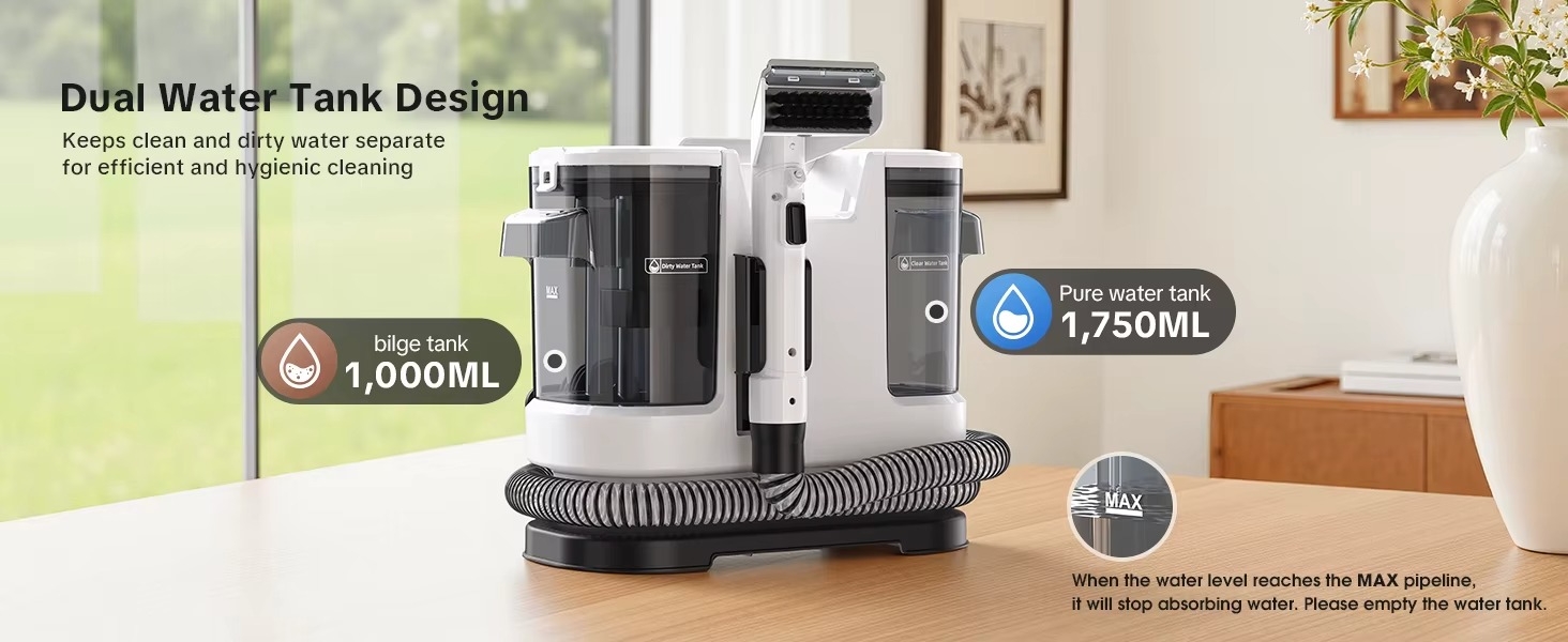 - Stor 1,75L dubbeltank – Rengör större ytor utan avbrott, med separat tank för smutsvatten.